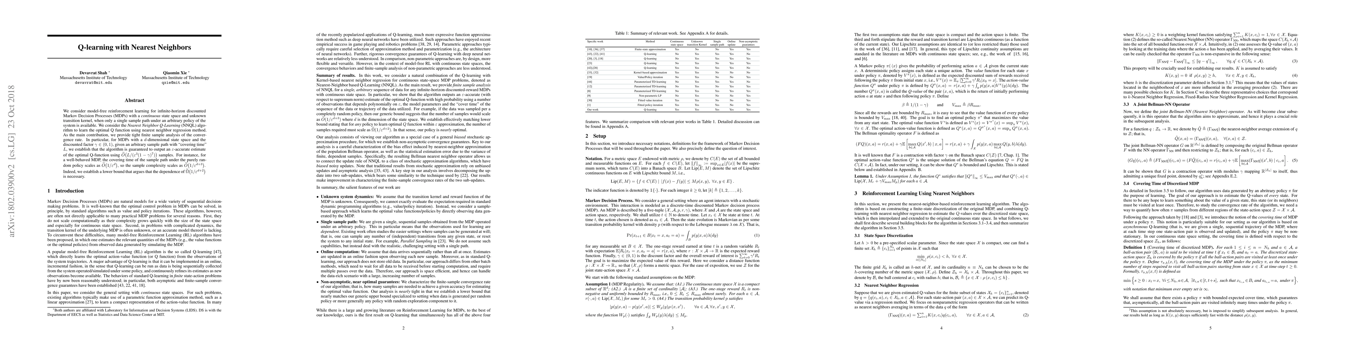 This paper proposes the Nearest Neighbor Q-Learning (NNQL) algorithm for model-free reinforcement learning in continuous-state MDPs. It provides tight finite sample analysis showing that NNQL can achieve an $\varepsilon$-accurate estimate of the optimal Q-function using $\tilde{O}\big(L/(\varepsilon^3(1-\gamma)^7)\big)$ samples, where $L$ is the covering time of the sample path.