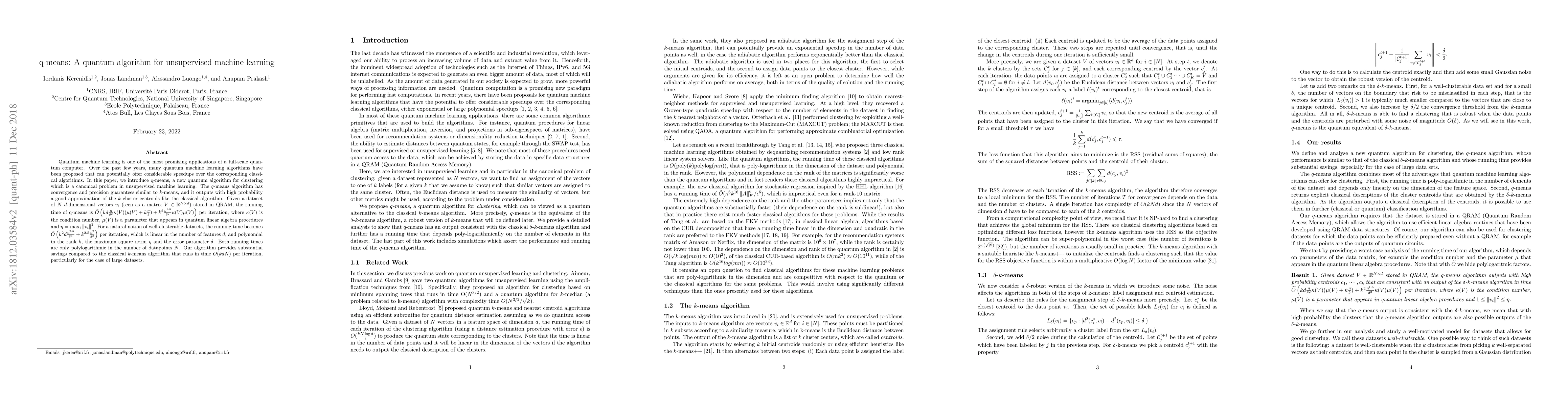 The paper introduces q-means, a quantum algorithm for clustering in unsupervised machine learning, offering convergence and precision guarantees similar to classical k-means. It provides substantial speedups over the classical k-means algorithm, especially for large datasets, with running times that are linear in features and polynomial in other parameters.