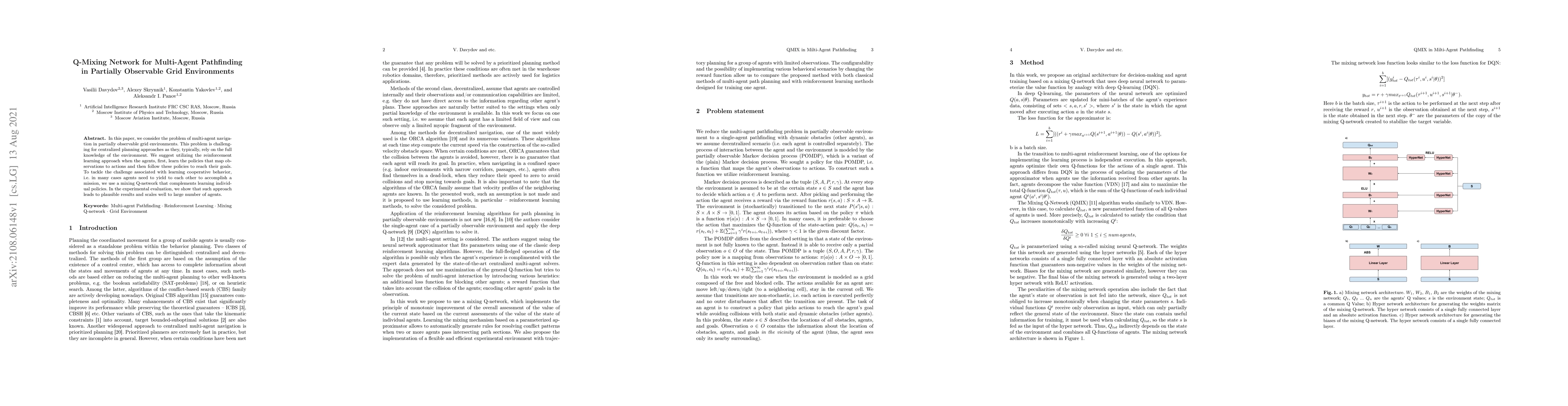 This paper proposes a reinforcement learning approach for multi-agent pathfinding in partially observable grid environments, using a Q-mixing network to facilitate cooperative behavior among agents. Experimental results demonstrate the effectiveness and scalability of the method for large agent groups.