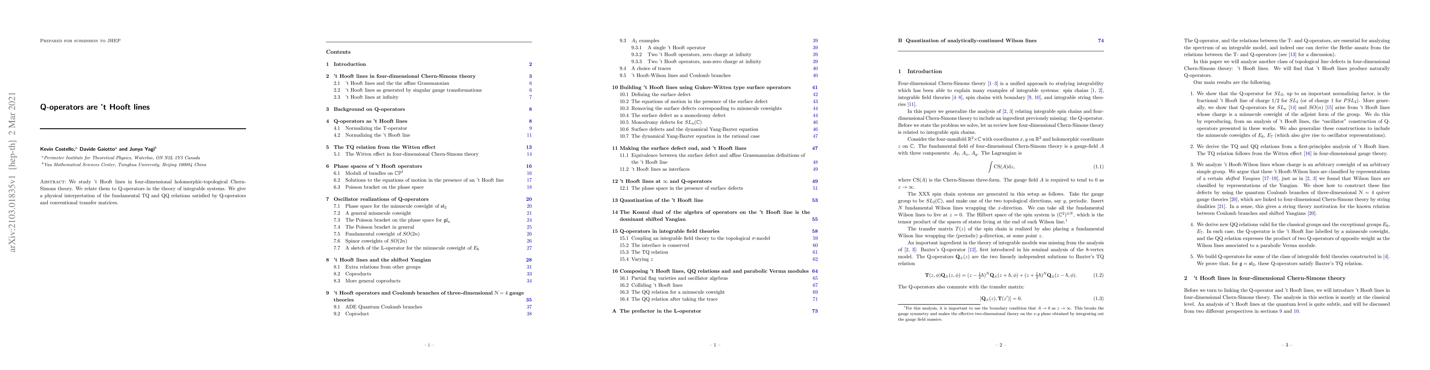 This paper connects 't Hooft lines in four-dimensional holomorphic-topological Chern-Simons theory to Q-operators in integrable systems, providing a physical interpretation of the fundamental TQ and QQ relations.
