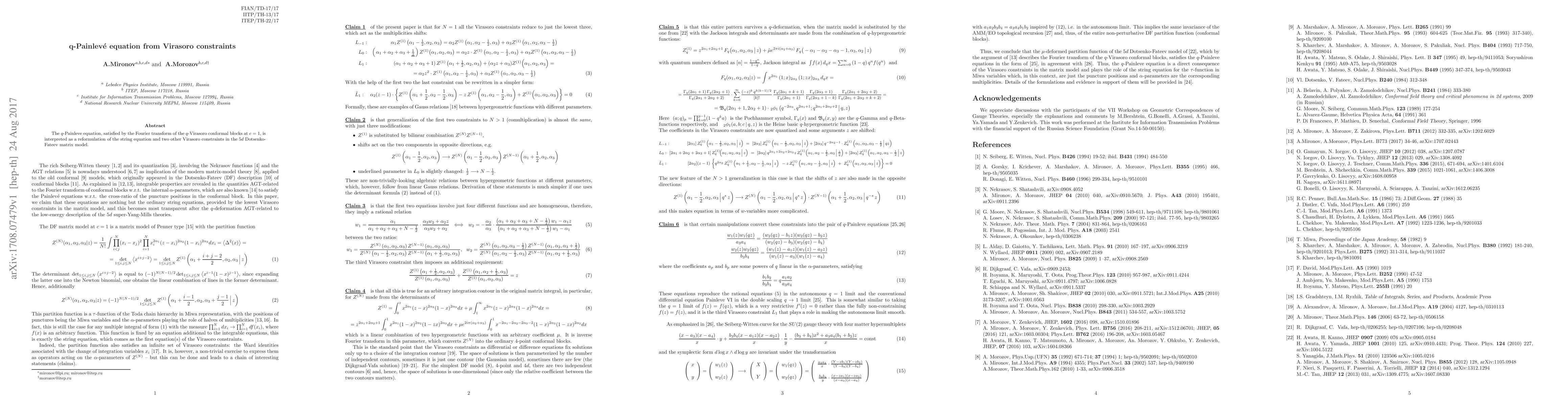 The paper derives the q-Painleve equation from Virasoro constraints in the context of the $5d$ Dotsenko-Fateev matrix model, reinterpreting it as a reformulation of string equation and additional Virasoro constraints.