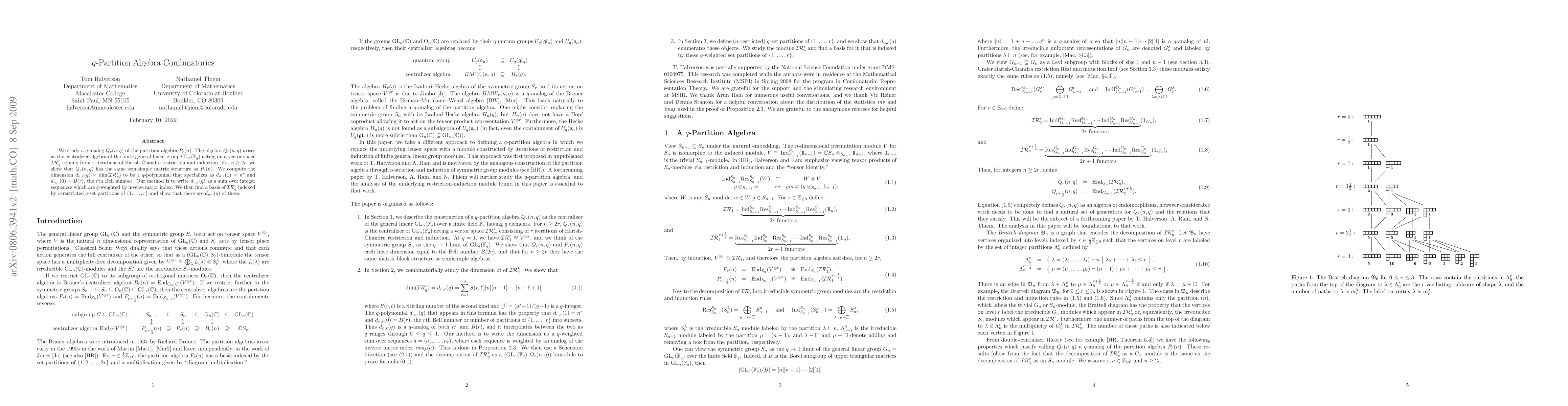 We compute the dimension $d_{n,r}(q) = \dim(\IR_q^r)$ of the defining module $\IR_q^r$ for the $q$-partition algebra. This module comes from $r$-iterations of Harish-Chandra restriction and induction on $\GL_n(\FF_q)$. This dimension is a polynomial in $q$ that specializes as $d_{n,r}(1) = n^r$ and $d_{n,r}(0) = B(r)$, the $r$th Bell number. We compute $d_{n,r}(q)$ in two ways. The first is purely combinatorial. We show that $d_{n,r}(q) = \sum_\lambda f^\lambda(q) m_r^\lambda$, where $f^\lambda(q)$ is the $q$-hook number and $m_r^\lambda$ is the number of $r$-vacillating tableaux. Using a Schensted bijection, we write this as a sum over integer sequences which, when $q$-counted by inverse major index, gives $d_{n,r}(q)$. The second way is algebraic. We find a basis of $\IR_q^r$ that is indexed by $n$-restricted $q$-set partitions of $\{1,..., r\}$, and we show that there are $d_{n,r}(q)$ of these.
