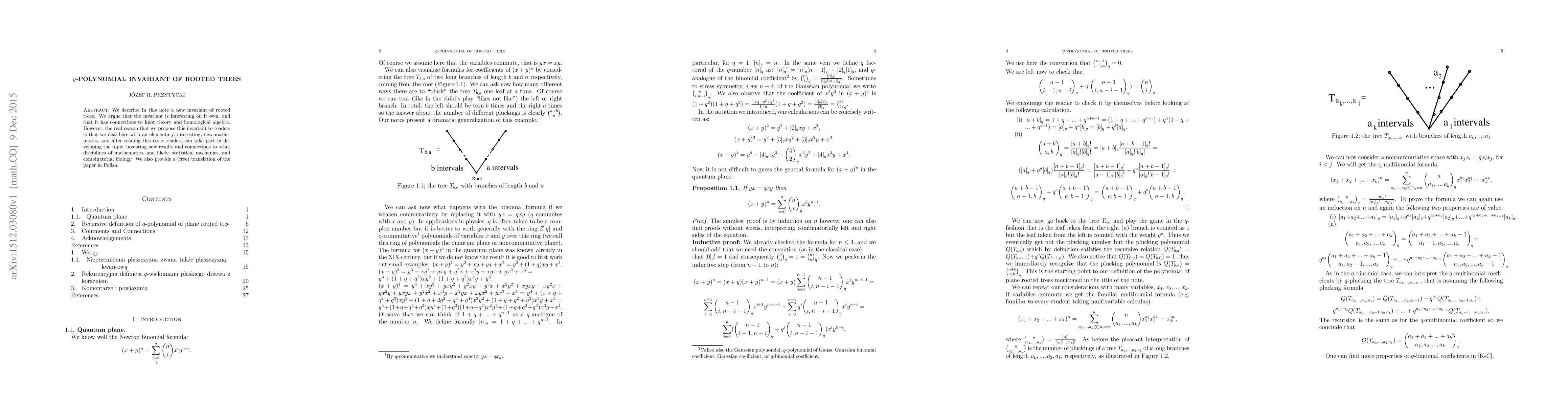 We describe in this note a new invariant of rooted trees. We argue that the invariant is interesting on it own, and that it has connections to knot theory and homological algebra. However, the real reason that we propose this invariant to readers is that we deal here with an elementary, interesting, new mathematics, and after reading this essay readers can take part in developing the topic, inventing new results and connections to other disciplines of mathematics, and likely, statistical mechanics, and combinatorial biology. We also provide a (free) translation of the paper in Polish.