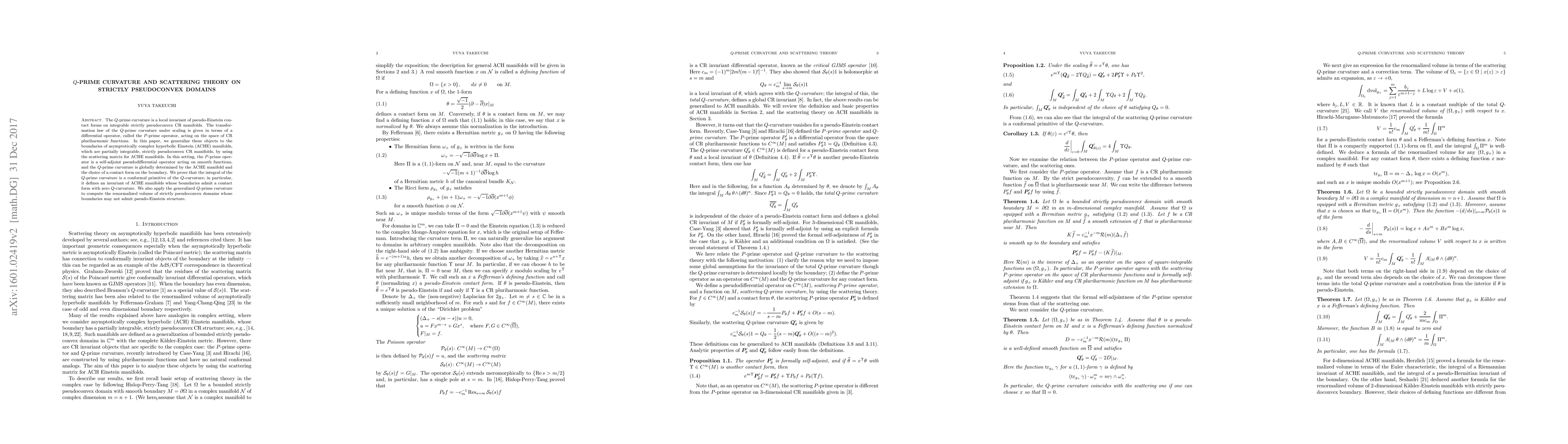 The $Q$-prime curvature is a local invariant of pseudo-Einstein contact forms on integrable strictly pseudoconvex CR manifolds. The transformation law of the $Q$-prime curvature under scaling is given in terms of a differential operator, called the $P$-prime operator, acting on the space of CR pluriharmonic functions. In this paper, we generalize these objects to the boundaries of asymptotically complex hyperbolic Einstein (ACHE) manifolds, which are partially integrable, strictly pseudoconvex CR manifolds, by using the scattering matrix for ACHE manifolds. In this setting, the $P$-prime operator is a self-adjoint pseudodifferential operator acting on smooth functions and the $Q$-prime curvature is globally determined by the ACHE manifold and the choice of a contact form on the boundary. We prove that the integral of the $Q$-prime curvature is a conformal primitive of the $Q$-curvature; in particular, it defines an invariant of ACHE manifolds whose boundaries admit a contact form with zero $Q$-curvature. We also apply the generalized $Q$-prime curvature to compute the renormalized volume of strictly pseudoconvex domains whose boundaries may not admit pseudo-Einstein structure.