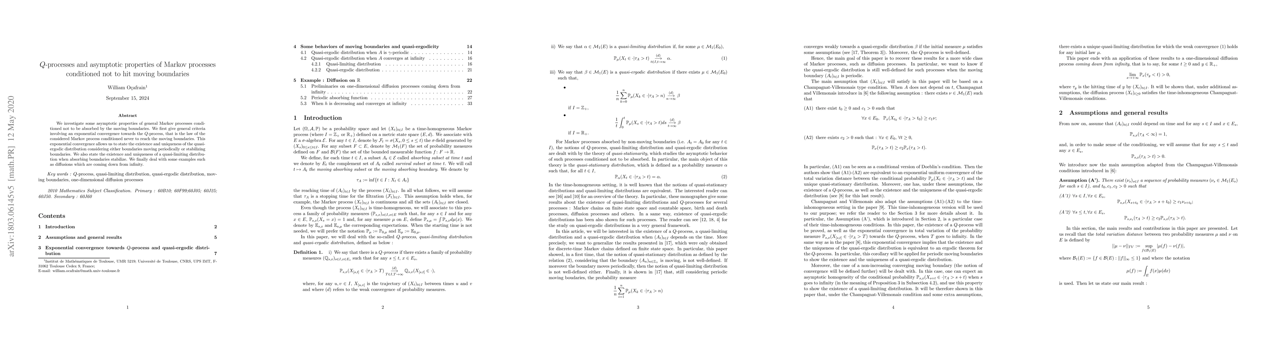This paper explores the asymptotic behavior of Markov processes conditioned to avoid moving boundaries, establishing criteria for exponential convergence to the Q-process. It proves the existence and uniqueness of quasi-ergodic and quasi-limit distributions under various boundary conditions, and applies these findings to examples like diffusions from infinity.