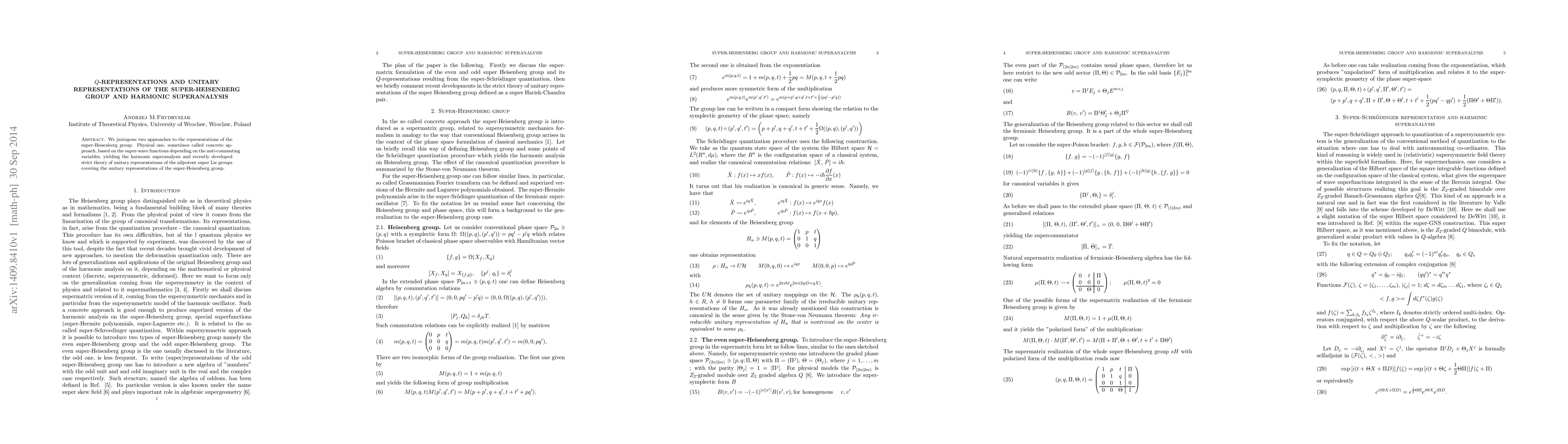 We juxtapose two approaches to the representations of the super-Heisenberg group. Physical one, sometimes called concrete approach, based on the super-wave functions depending on the anti-commuting variables, yielding the harmonic superanalysis and recently developed strict theory of unitary representations of the nilpotent super Lie groups covering the unitary representations of the super-Heisenberg group.