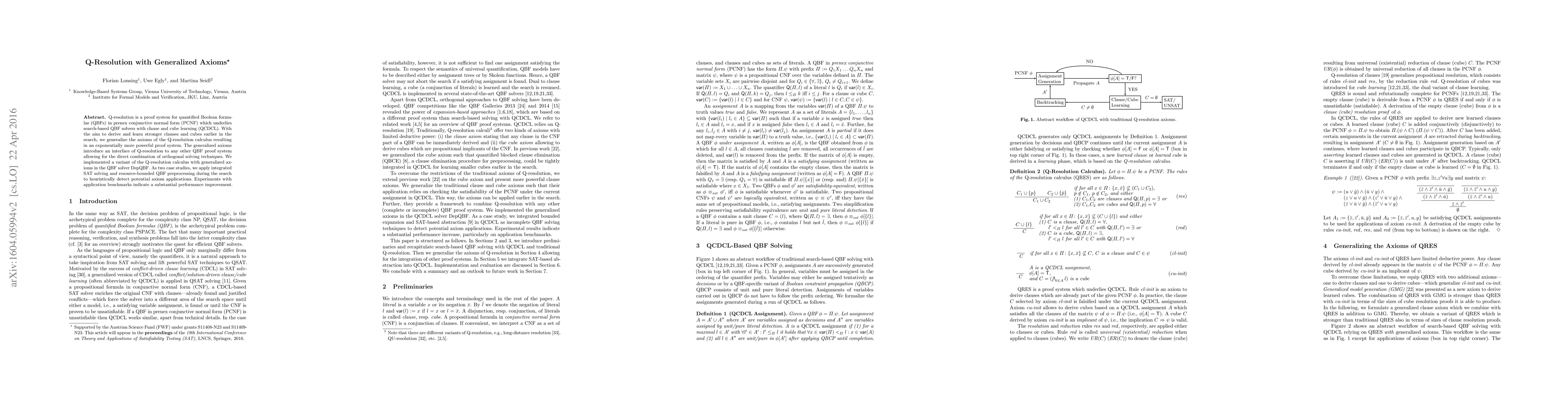 Q-resolution is a proof system for quantified Boolean formulas (QBFs) in prenex conjunctive normal form (PCNF) which underlies search-based QBF solvers with clause and cube learning (QCDCL). With the aim to derive and learn stronger clauses and cubes earlier in the search, we generalize the axioms of the Q-resolution calculus resulting in an exponentially more powerful proof system. The generalized axioms introduce an interface of Q-resolution to any other QBF proof system allowing for the direct combination of orthogonal solving techniques. We implemented a variant of the Q-resolution calculus with generalized axioms in the QBF solver DepQBF. As two case studies, we apply integrated SAT solving and resource-bounded QBF preprocessing during the search to heuristically detect potential axiom applications. Experiments with application benchmarks indicate a substantial performance improvement.