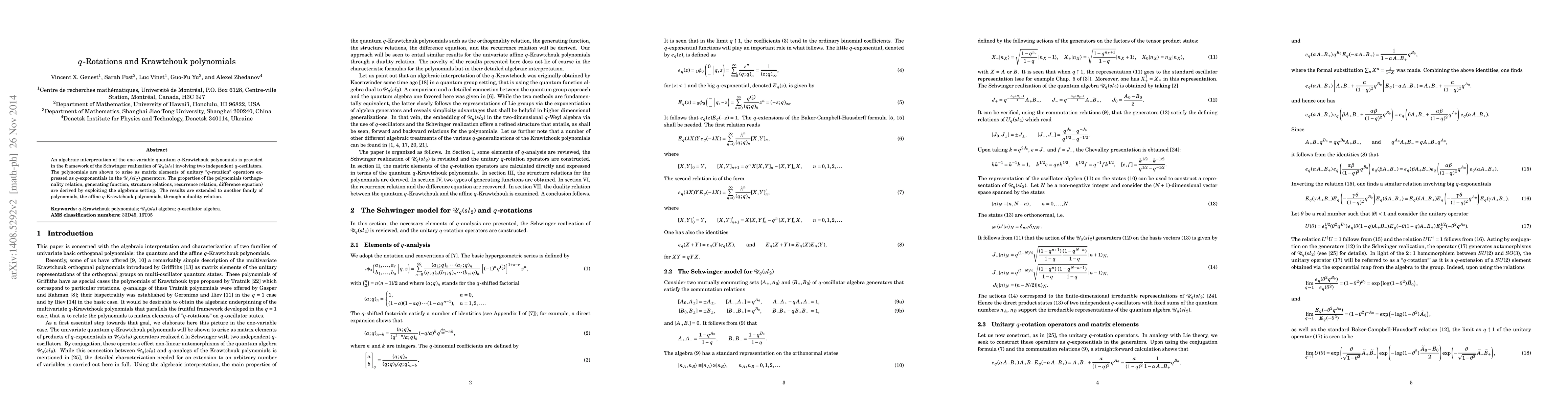 An algebraic interpretation of the one-variable quantum $q$-Krawtchouk polynomials is provided in the framework of the Schwinger realization of $\mathcal{U}_{q}(sl_{2})$ involving two independent $q$-oscillators. The polynomials are shown to arise as matrix elements of unitary "$q$-rotation" operators expressed as $q$-exponentials in the $\mathcal{U}_{q}(sl_{2})$ generators. The properties of the polynomials (orthogonality relation, generating function, structure relations, recurrence relation, difference equation) are derived by exploiting the algebraic setting. The results are extended to another family of polynomials, the affine $q$-Krawtchouk polynomials, through a duality relation.