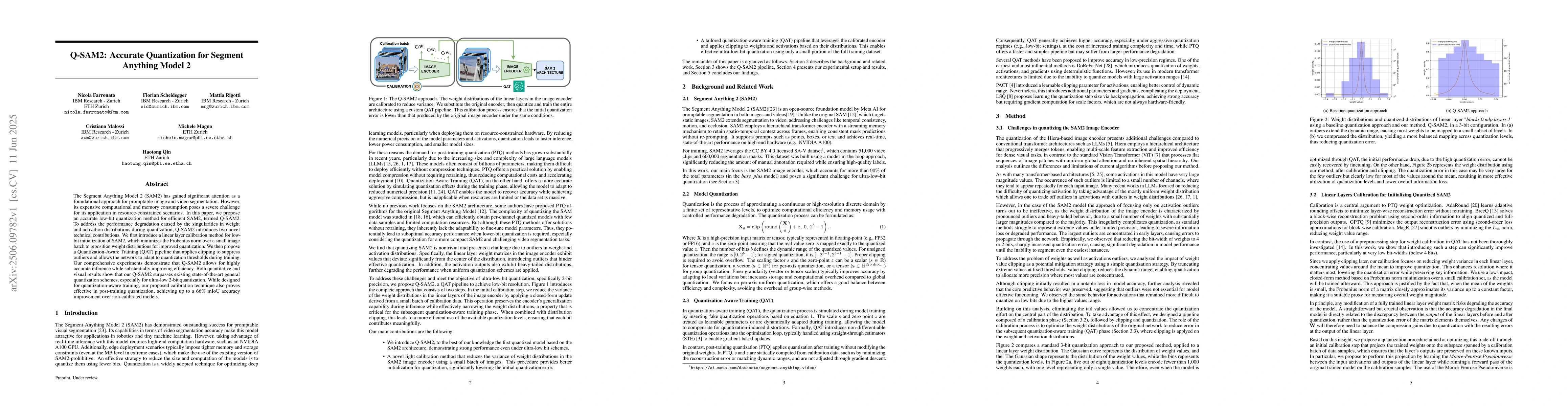 Q-SAM2 proposes a low-bit quantization method for efficient SAM2 segmentation, achieving highly accurate inference while improving efficiency, surpassing existing state-of-the-art schemes, especially with ultra-low 2-bit quantization.