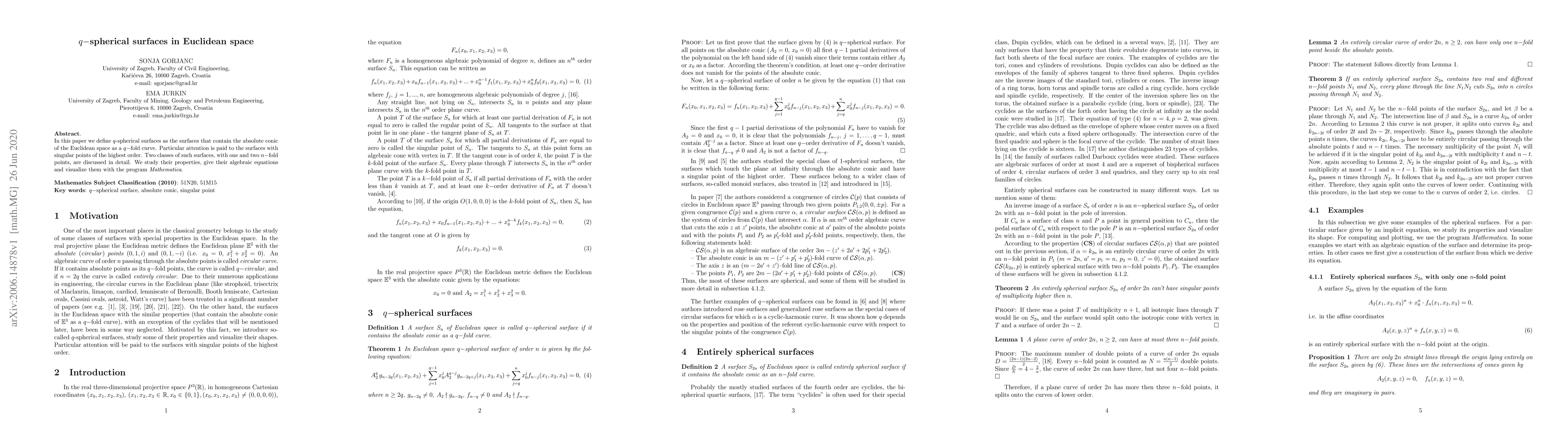 This paper introduces $q$-spherical surfaces in Euclidean space, defined by containing the absolute conic as a $q$-fold curve. It focuses on surfaces with singular points of the highest order, detailing two classes with one and two $n$-fold points, and provides their algebraic equations and visualizations using Mathematica.