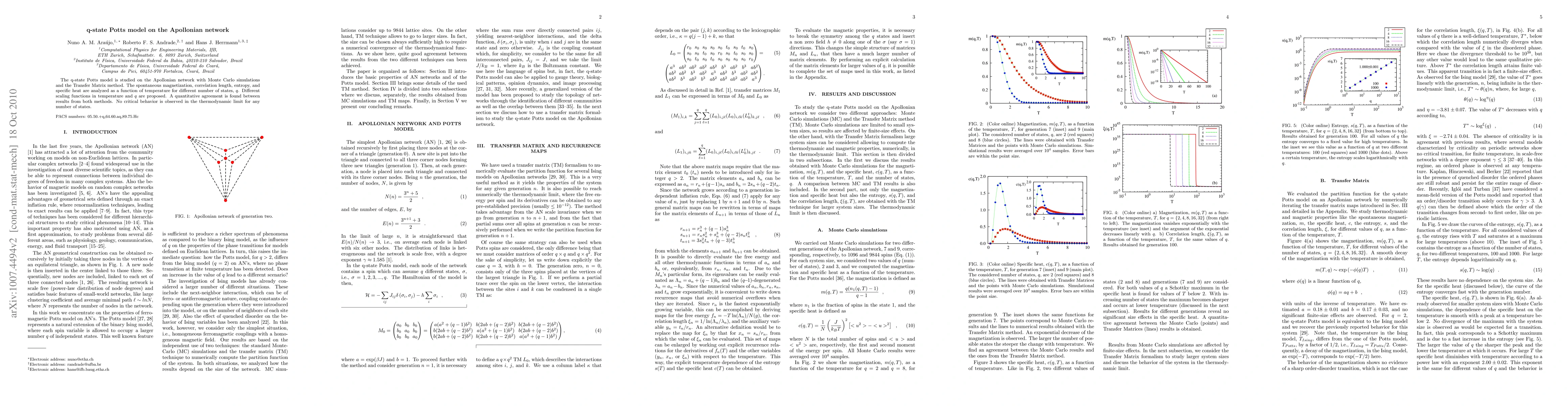 The study investigates the q-state Potts model on the Apollonian network using Monte Carlo simulations and the Transfer Matrix method, finding no critical behavior in the thermodynamic limit for any number of states, $q$, despite analyzing spontaneous magnetization, correlation length, entropy, and specific heat.