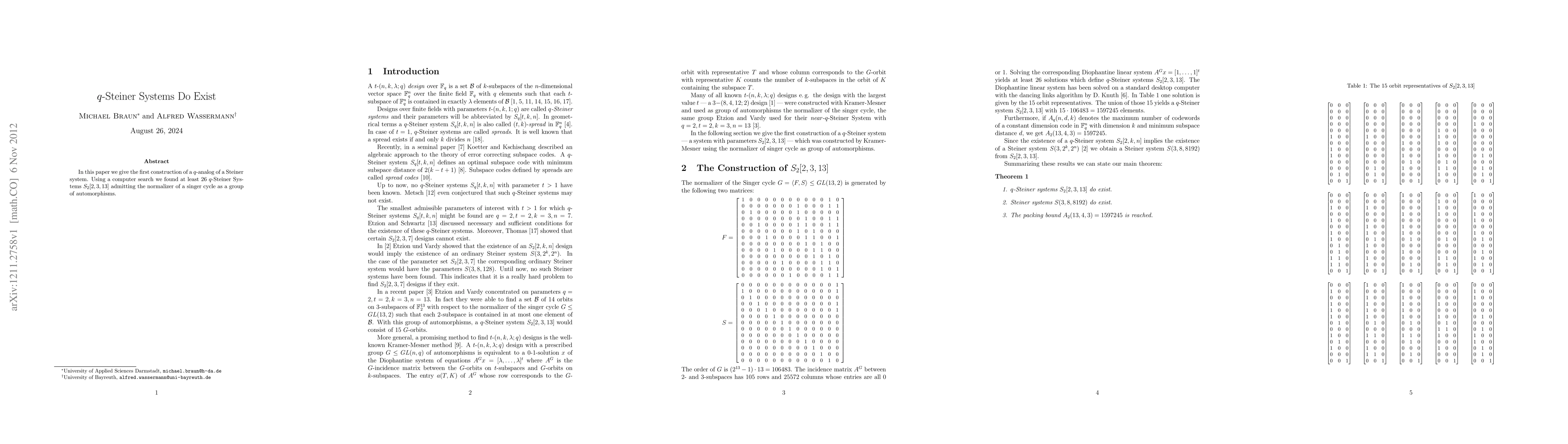This paper presents the first construction of a q-analog of a Steiner system, specifically identifying 26 instances of q-Steiner Systems S_2[2,3,13], with their automorphisms being the normalizer of a Singer cycle, discovered through computational methods.