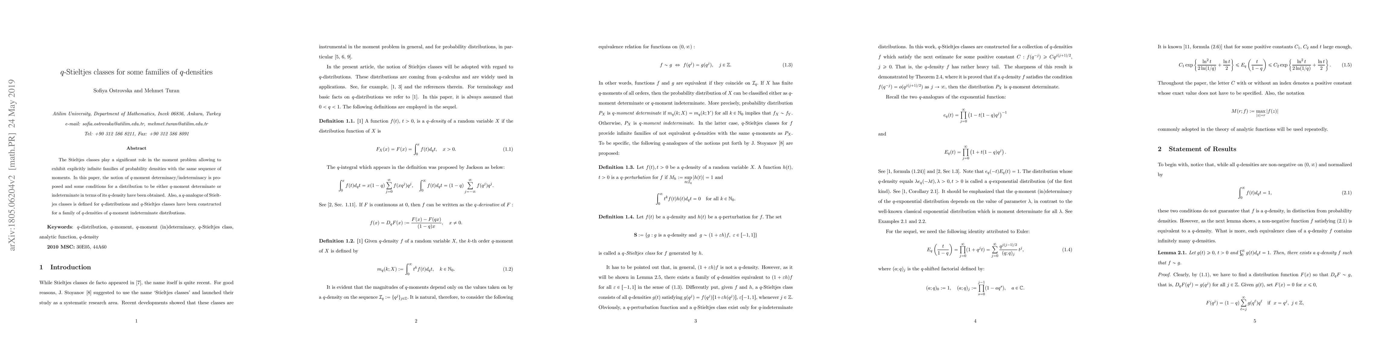 This paper introduces the concept of $q$-moment determinacy/indeterminacy and defines $q$-analogue Stieltjes classes for $q$-distributions, constructing $q$-Stieltjes classes for a family of $q$-densities of $q$-moment indeterminate distributions. The study extends the classical moment problem to the $q$-setting.