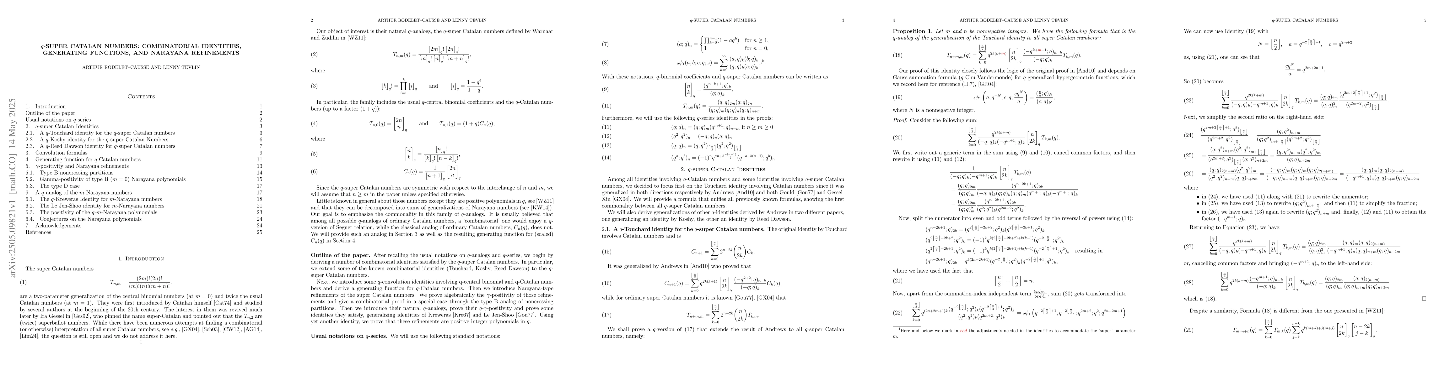 The paper derives combinatorial identities for q-super Catalan numbers, extends known identities, introduces q-convolution identities, and proves algebraic and combinatorial properties of Narayana-type refinements.