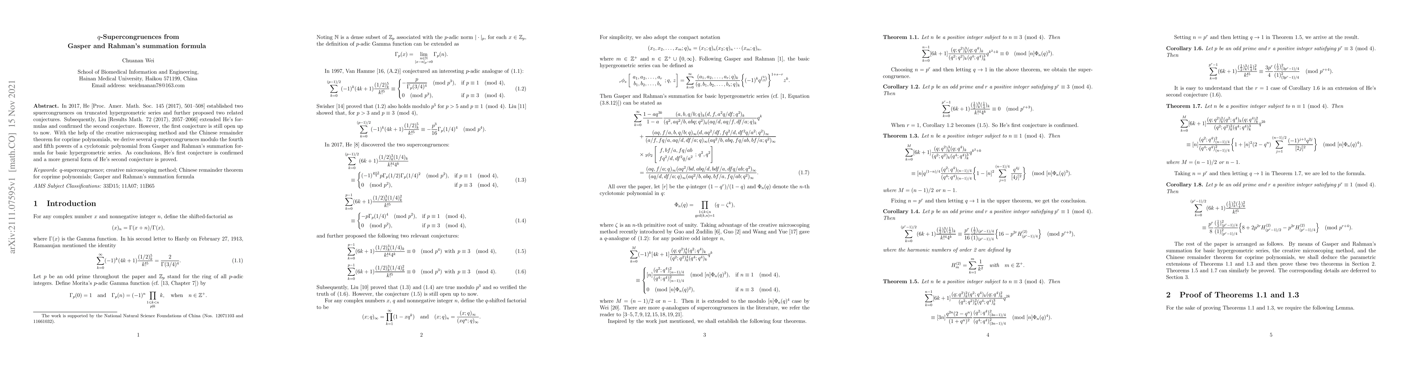 In 2017, He [Proc. Amer. Math. Soc. 145 (2017), 501--508] established two spuercongruences on truncated hypergeometric series and further proposed two related conjectures. Subsequently, Liu [Results Math. 72 (2017), 2057--2066] extended He's formulas and confirmed the second conjecture. However, the first conjecture is still open up to now. With the help of the creative microscoping method and the Chinese remainder theorem for coprime polynomials, we derive several $q$-supercongruences modulo the fourth and fifth powers of a cyclotomic polynomial from Gasper and Rahman's summation formula for basic hypergeometric series. As conclusions, He's first conjecture is confirmed and a more general form of He's second conjecture is proved.