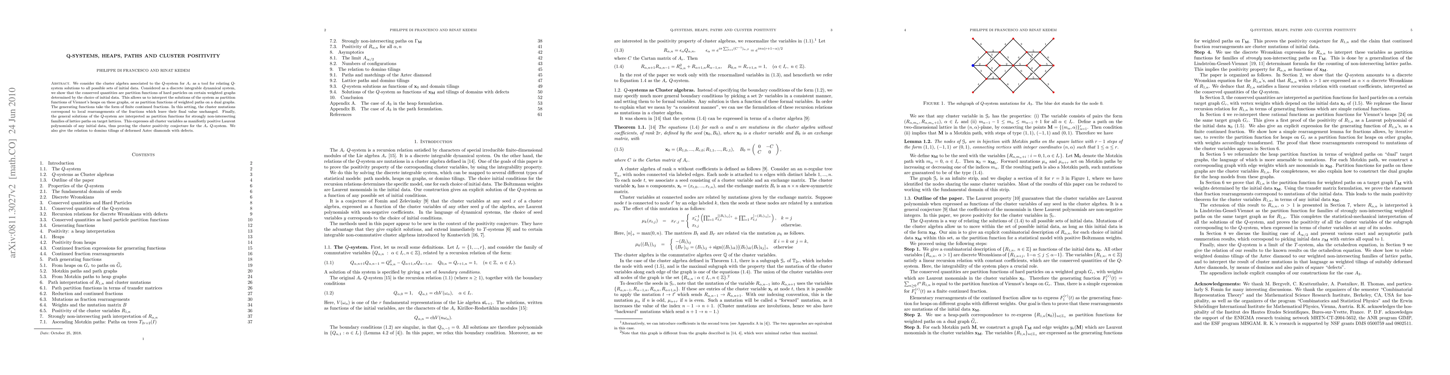 We consider the cluster algebra associated to the $Q$-system for $A_r$ as a tool for relating $Q$-system solutions to all possible sets of initial data. We show that the conserved quantities of the $Q$-system are partition functions for hard particles on particular target graphs with weights, which are determined by the choice of initial data. This allows us to interpret the simplest solutions of the Q-system as generating functions for Viennot's heaps on these target graphs, and equivalently as generating functions of weighted paths on suitable dual target graphs. The generating functions take the form of finite continued fractions. In this setting, the cluster mutations correspond to local rearrangements of the fractions which leave their final value unchanged. Finally, the general solutions of the $Q$-system are interpreted as partition functions for strongly non-intersecting families of lattice paths on target lattices. This expresses all cluster variables as manifestly positive Laurent polynomials of any initial data, thus proving the cluster positivity conjecture for the $A_r$ $Q$-system. We also give an alternative formulation in terms of domino tilings of deformed Aztec diamonds with defects.
