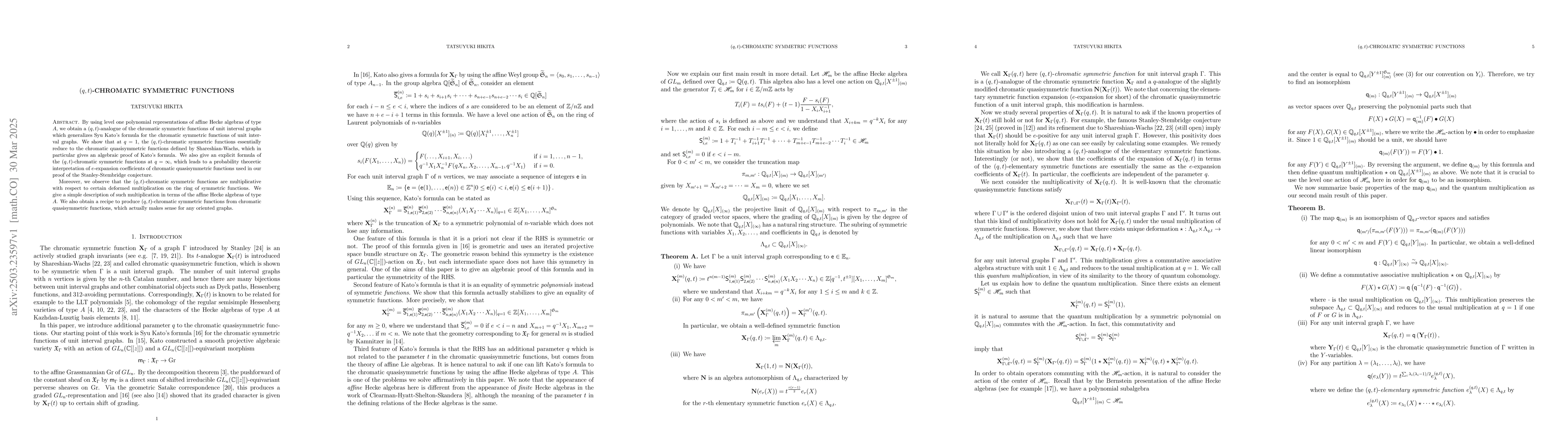 The development of (q,t)-chromatic symmetric functions as a (q,t)-analogue of chromatic symmetric functions using affine Hecke algebras of type A, along with their multiplicative property and explicit formulas.