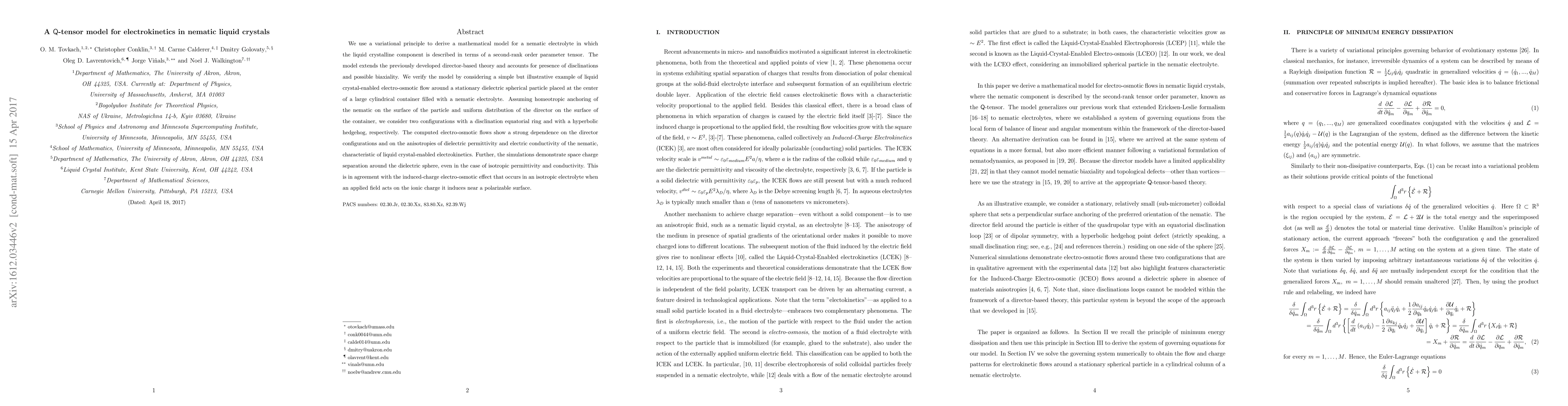 We use a variational principle to derive a mathematical model for a nematic electrolyte in which the liquid crystalline component is described in terms of a second-rank order tensor. The model extends the previously developed director-based theory and accounts for presence of disclinations and possible biaxiality. We verify the model by considering a simple but illustrative example of liquid crystal-enabled electro-osmotic flow (LCEO) around a stationary dielectric spherical particle placed at the center of a large cylindrical container filled with a nematic electrolyte. Assuming homeotropic anchoring of the nematic on the surface of the particle and uniform distribution of the director on the surface of the container, we consider two configurations with a disclination equatorial ring and with a hyperbolic hedgehog, respectively. The computed electro-osmotic flows show a strong dependence on the director configurations and on the anisotropies of dielectric permittivity and electric conductivity of the nematic characteristic of liquid crystal-enabled electrokinetics. Further, the simulations demonstrate space charge separation around the dielectric sphere, even in the case of isotropic permittivity and conductivity. This is in agreement with the induced-charge electro-osmotic effect described for isotropic electrolytes surrounding dielectric spheres.