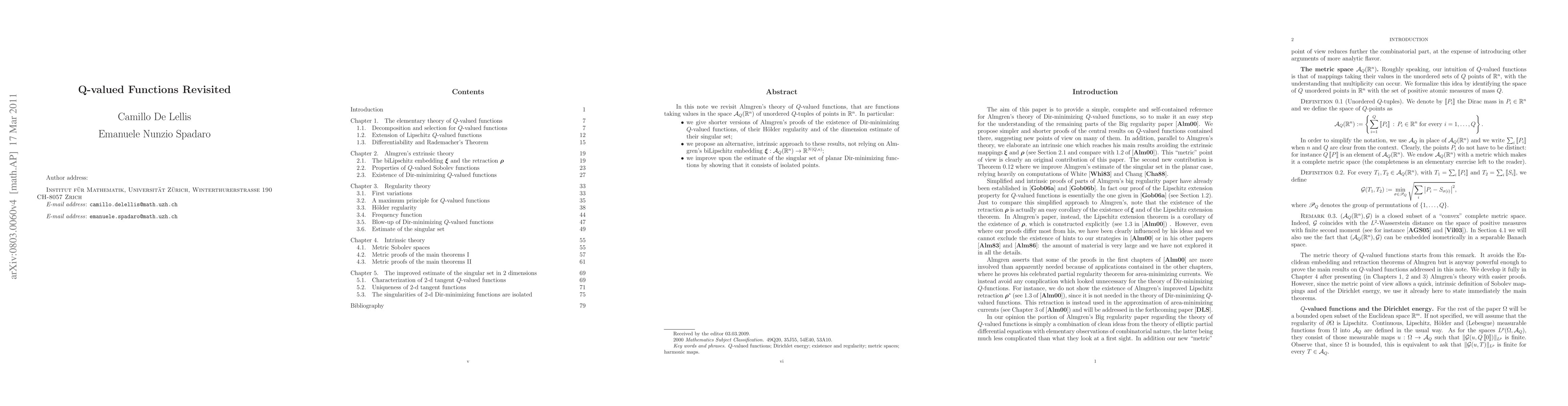This paper revisits Almgren's theory of Q-valued functions, providing shorter proofs of their existence, Hölder regularity, and dimension estimate of singular sets. It also introduces an intrinsic approach independent of Almgren's embedding, and improves the singular set estimate for planar functions to isolated points.