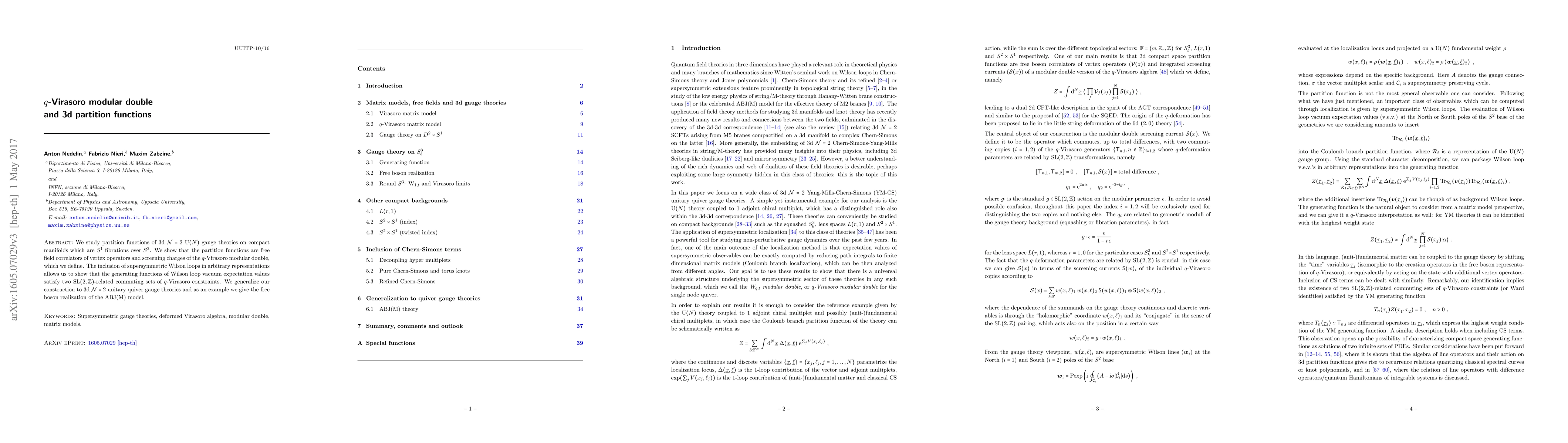 We study partition functions of 3d $\mathcal{N}=2$ U(N) gauge theories on compact manifolds which are $S^1$ fibrations over $S^2$. We show that the partition functions are free field correlators of vertex operators and screening charges of the $q$-Virasoro modular double, which we define. The inclusion of supersymmetric Wilson loops in arbitrary representations allows us to show that the generating functions of Wilson loop vacuum expectation values satisfy two SL(2,$\mathbb{Z}$)-related commuting sets of $q$-Virasoro constraints. We generalize our construction to 3d $\mathcal{N}=2$ unitary quiver gauge theories and as an example we give the free boson realization of the ABJ(M) model.