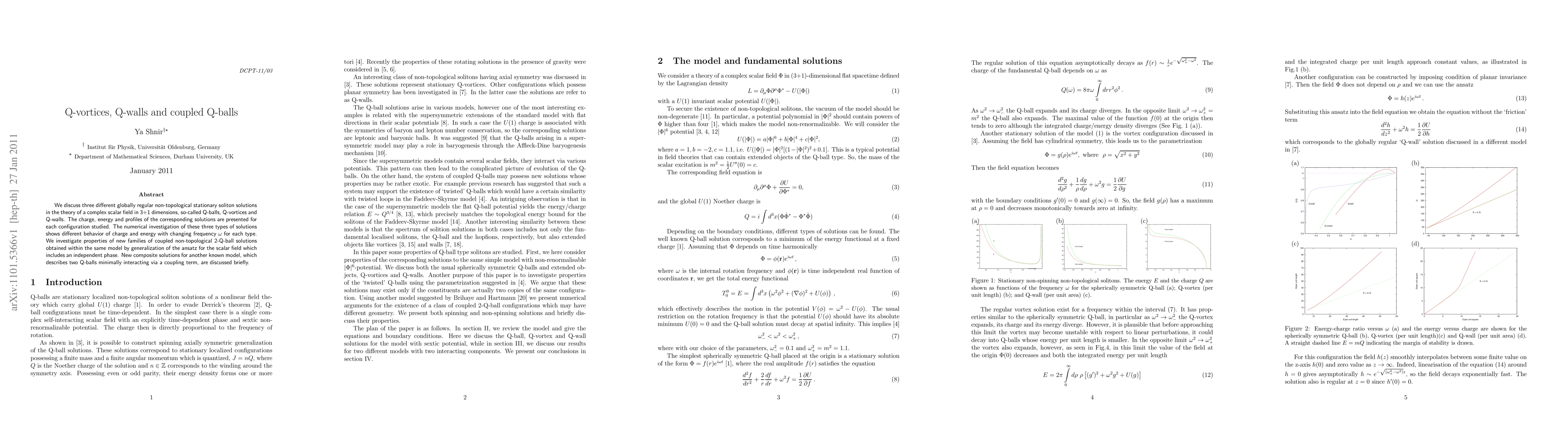 We discuss three different globally regular non-topological stationary soliton solutions in the theory of a complex scalar field in 3+1 dimensions, so-called Q-balls, Q-vortices and Q-walls. The charge, energy and profiles of the corresponding solutions are presented for each configuration studied. The numerical investigation of these three types of solutions shows different behavior of charge and energy with changing frequency for each type. We investigate properties of new families of coupled non-topological 2-Q-ball solutions obtained within the same model by generalization of the ansatz for the scalar field which includes an independent phase. New composite solutions for another known model, which describes two Q-balls minimally interacting via a coupling term, are discussed briefly.