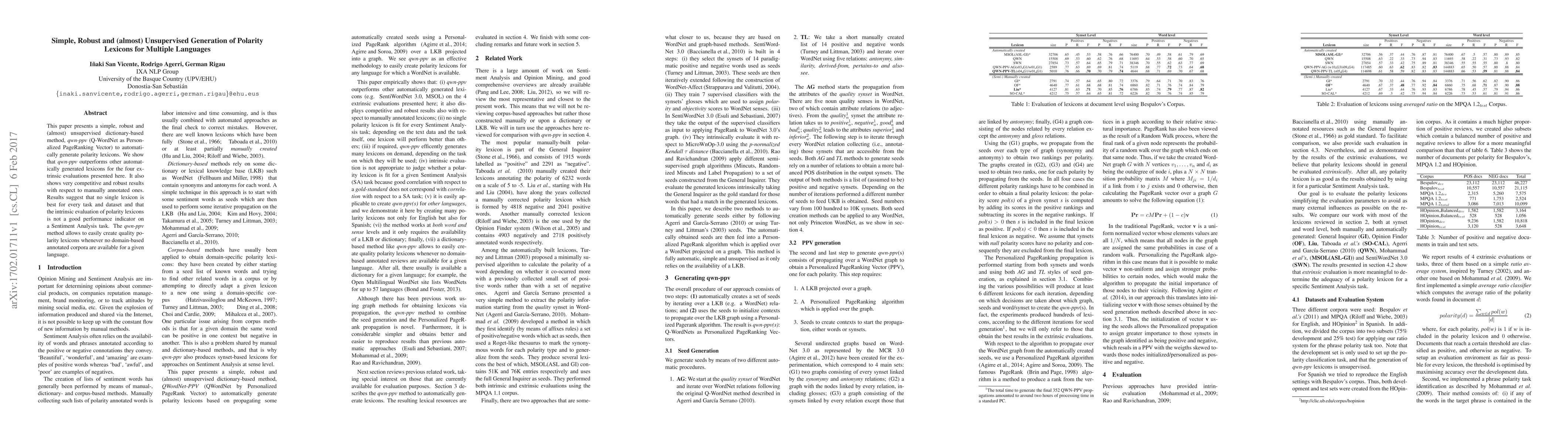 This paper presents a simple, robust and (almost) unsupervised dictionary-based method, qwn-ppv (Q-WordNet as Personalized PageRanking Vector) to automatically generate polarity lexicons. We show that qwn-ppv outperforms other automatically generated lexicons for the four extrinsic evaluations presented here. It also shows very competitive and robust results with respect to manually annotated ones. Results suggest that no single lexicon is best for every task and dataset and that the intrinsic evaluation of polarity lexicons is not a good performance indicator on a Sentiment Analysis task. The qwn-ppv method allows to easily create quality polarity lexicons whenever no domain-based annotated corpora are available for a given language.