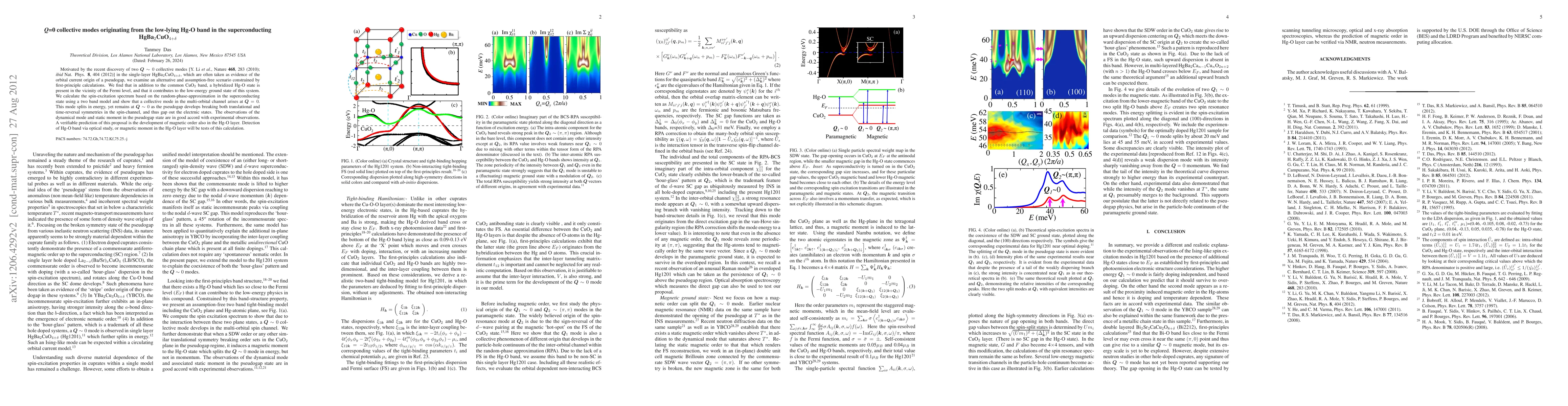 Motivated by the recent discovery of two Q\sim0 collective modes [Y. Li et al., Nature 468, 283 (2010); ibid Nat. Phys. 8, 404 (2012)] in the single-layer HgBa2CuO4+\delta, which are often taken as evidence of the orbital current origin of a pseudogap, we examine an alternative and assumption-free scenario constrained by first-principle calculations. We find that in addition to the common CuO2 band, a hybridized Hg-O state is present in the vicinity of the Fermi level, and that it contributes to the low-energy ground state of this system. We calculate the spin-excitation spectrum based on the random-phase-approximation in the superconducting state using a two band model and show that a collective mode in the multi-orbital channel arises at Q=0. This mode splits in energy, yet remains at Q\sim0 as the pseudogap develops breaking both translational and time-reversal symmetries in the spin-channel, and thus gap out the electrnic states. The observations of the dynamical mode and static moment in the pseudogap state are in good accord with experimental observations. A verifiable prediction of this proposal is the development of magnetic order also in the Hg-O layer. Detection of Hg-O band via optical study, or magnetic moment in the Hg-O layer will be tests of this calculation.