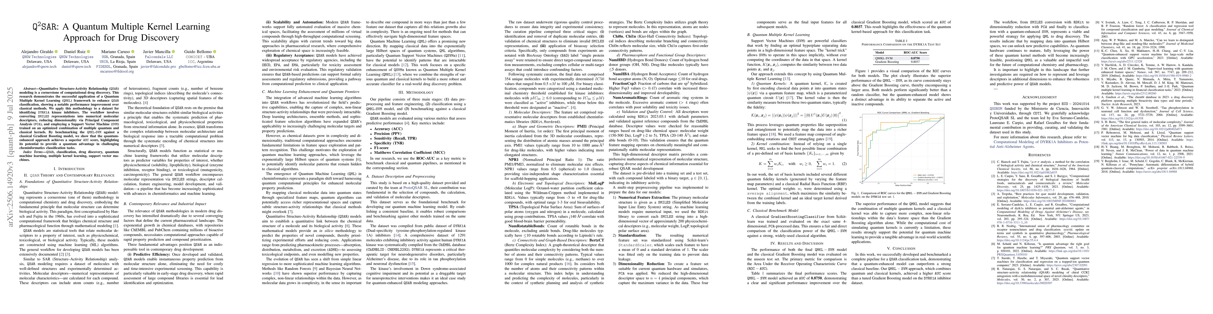 Quantitative Structure-Activity Relationship (QSAR) modeling is a cornerstone of computational drug discovery. This research demonstrates the successful application of a Quantum Multiple Kernel Learning (QMKL) framework to enhance QSAR classification, showing a notable performance improvement over classical methods. We apply this methodology to a dataset for identifying DYRK1A kinase inhibitors. The workflow involves converting SMILES representations into numerical molecular descriptors, reducing dimensionality via Principal Component Analysis (PCA), and employing a Support Vector Machine (SVM) trained on an optimized combination of multiple quantum and classical kernels. By benchmarking the QMKL-SVM against a classical Gradient Boosting model, we show that the quantum-enhanced approach achieves a superior AUC score, highlighting its potential to provide a quantum advantage in challenging cheminformatics classification tasks.