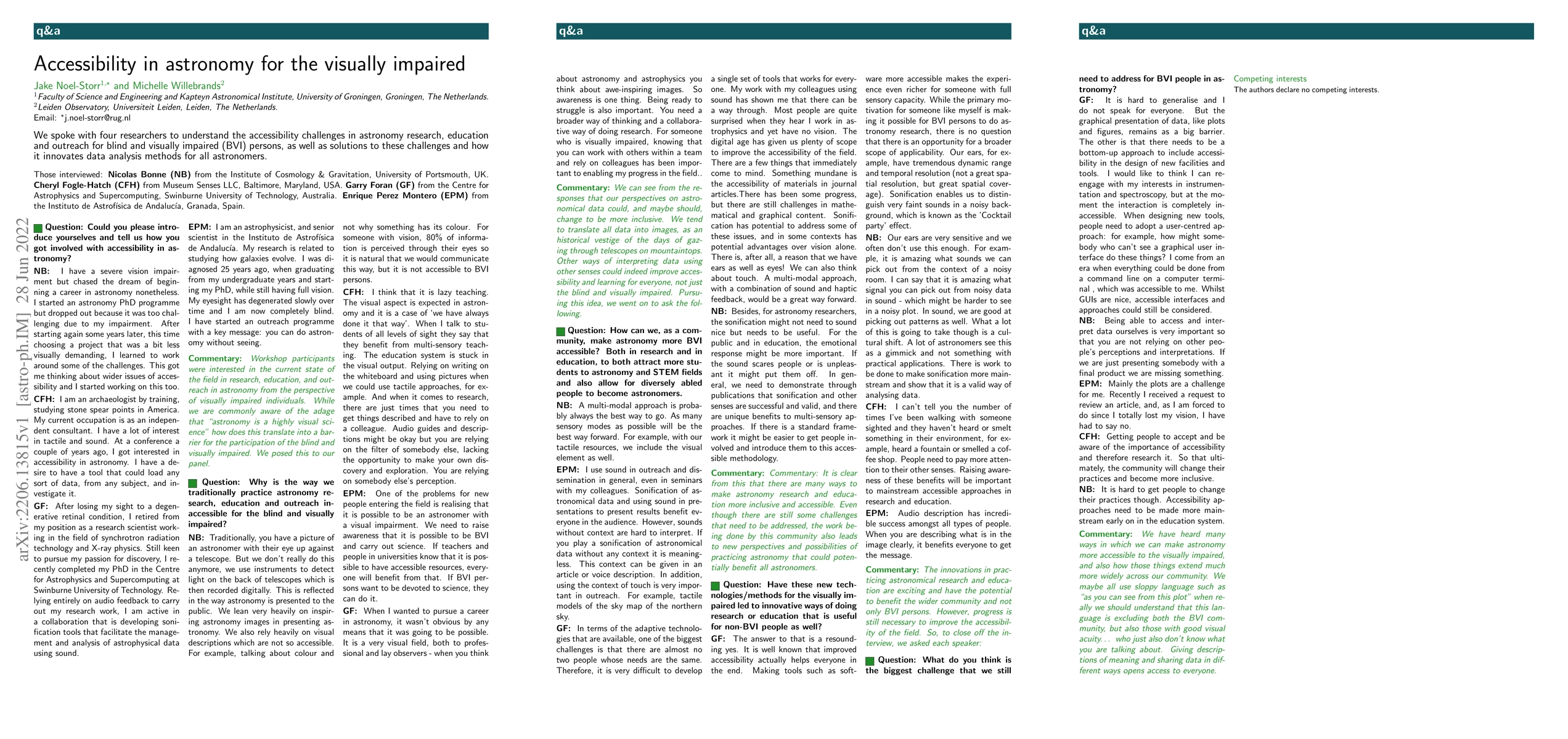We spoke with four researchers to understand the accessibility challenges in astronomy research, education and outreach for blind and visually impaired (BVI) persons, as well as solutions to these challenges and how it innovates data analysis methods for all astronomers. Those interviewed: Nicolas Bonne (University of Portsmouth); Cheryl Fogle-Hatch (Museum Senses); Garry Foran (Swinburne University of Technology) and Enrique Perez Montero (Instituto de Astrof\'isica de Andaluc\'ia).
