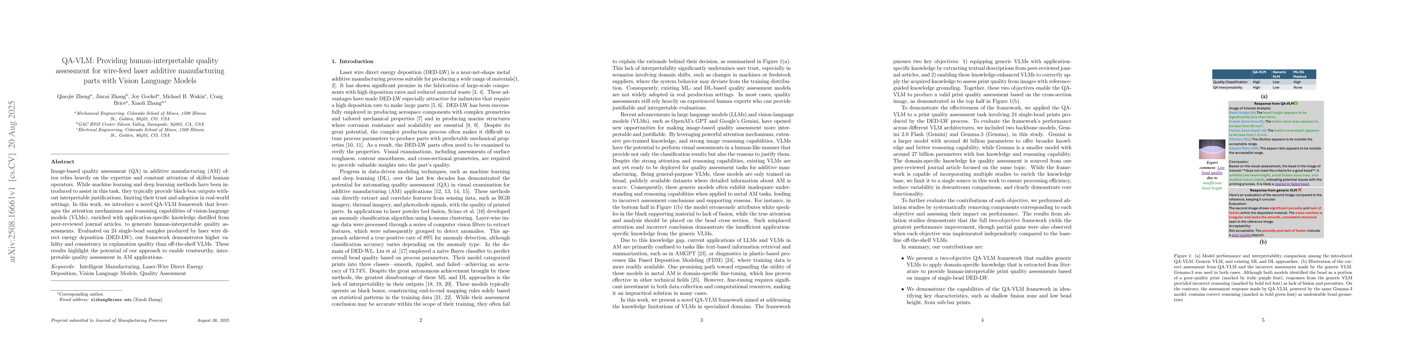 Image-based quality assessment (QA) in additive manufacturing (AM) often relies heavily on the expertise and constant attention of skilled human operators. While machine learning and deep learning methods have been introduced to assist in this task, they typically provide black-box outputs without interpretable justifications, limiting their trust and adoption in real-world settings. In this work, we introduce a novel QA-VLM framework that leverages the attention mechanisms and reasoning capabilities of vision-language models (VLMs), enriched with application-specific knowledge distilled from peer-reviewed journal articles, to generate human-interpretable quality assessments. Evaluated on 24 single-bead samples produced by laser wire direct energy deposition (DED-LW), our framework demonstrates higher validity and consistency in explanation quality than off-the-shelf VLMs. These results highlight the potential of our approach to enable trustworthy, interpretable quality assessment in AM applications.