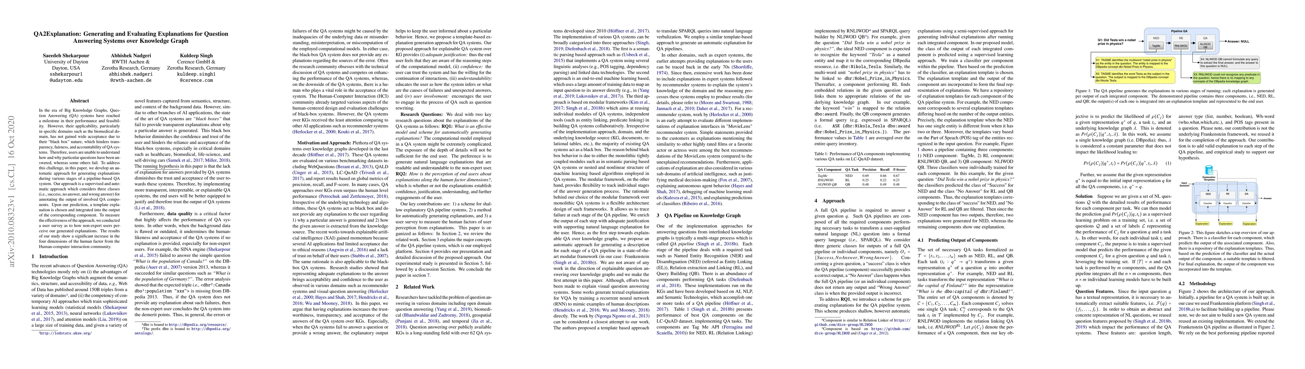 In the era of Big Knowledge Graphs, Question Answering (QA) systems have reached a milestone in their performance and feasibility. However, their applicability, particularly in specific domains such as the biomedical domain, has not gained wide acceptance due to their "black box" nature, which hinders transparency, fairness, and accountability of QA systems. Therefore, users are unable to understand how and why particular questions have been answered, whereas some others fail. To address this challenge, in this paper, we develop an automatic approach for generating explanations during various stages of a pipeline-based QA system. Our approach is a supervised and automatic approach which considers three classes (i.e., success, no answer, and wrong answer) for annotating the output of involved QA components. Upon our prediction, a template explanation is chosen and integrated into the output of the corresponding component. To measure the effectiveness of the approach, we conducted a user survey as to how non-expert users perceive our generated explanations. The results of our study show a significant increase in the four dimensions of the human factor from the Human-computer interaction community.