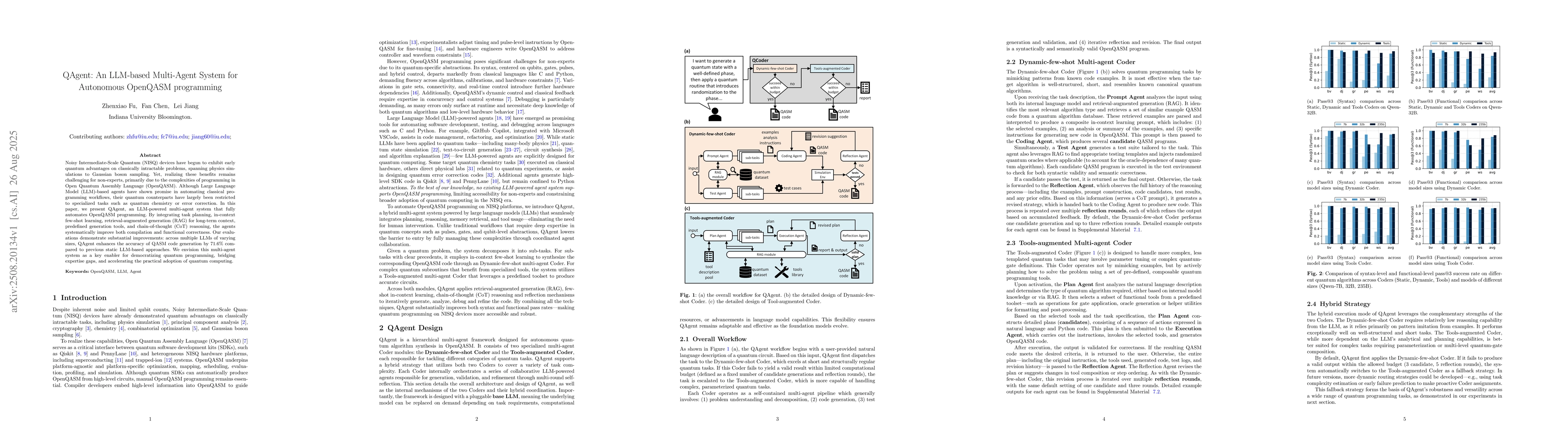Noisy Intermediate-Scale Quantum (NISQ) devices have begun to exhibit early quantum advantages on classically intractable problems, spanning physics simulations to Gaussian boson sampling. Yet, realizing these benefits remains challenging for non-experts, primarily due to the complexities of programming in Open Quantum Assembly Language (OpenQASM). Although Large Language Model (LLM)-based agents have shown promise in automating classical programming workflows, their quantum counterparts have largely been restricted to specialized tasks such as quantum chemistry or error correction. In this paper, we present QAgent, an LLM-powered multi-agent system that fully automates OpenQASM programming. By integrating task planning, in-context few-shot learning, retrieval-augmented generation (RAG) for long-term context, predefined generation tools, and chain-of-thought (CoT) reasoning, the agents systematically improve both compilation and functional correctness. Our evaluations demonstrate substantial improvements: across multiple LLMs of varying sizes, QAgent enhances the accuracy of QASM code generation by 71.6\% compared to previous static LLM-based approaches. We envision this multi-agent system as a key enabler for democratizing quantum programming, bridging expertise gaps, and accelerating the practical adoption of quantum computing.