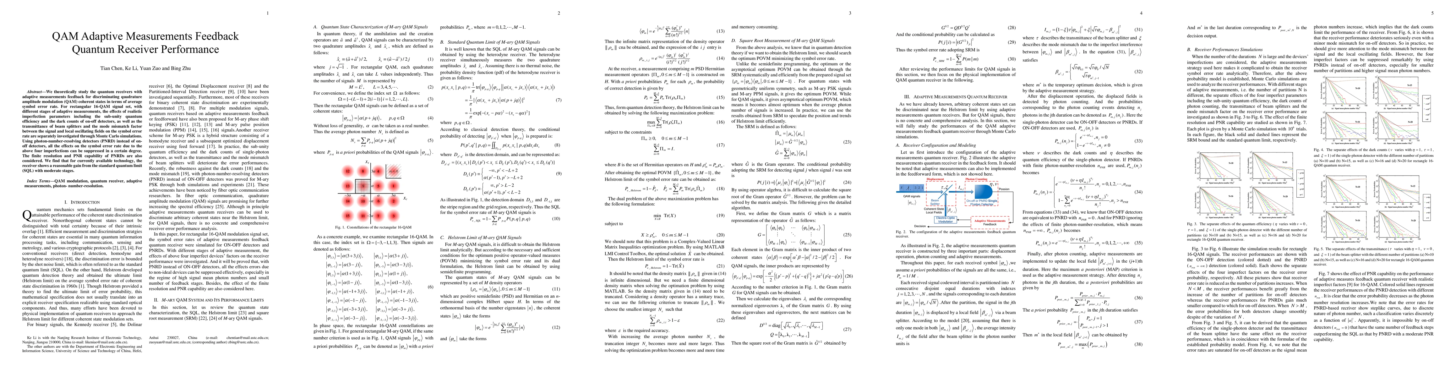 This paper investigates quantum receivers using adaptive measurements feedback for QAM signal discrimination, focusing on average symbol error rate. It examines the impact of imperfections like quantum efficiency, dark counts, and beam splitter transmittance, finding that photon-number-resolving detectors can mitigate these effects, offering a gain over the standard quantum limit.