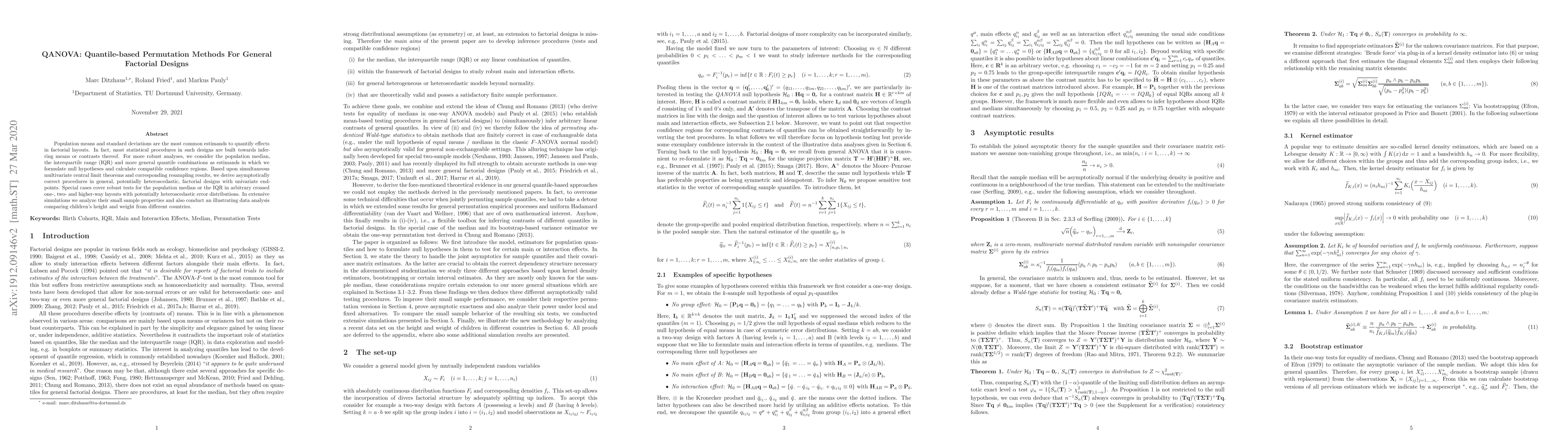This paper introduces QANOVA, a quantile-based permutation method for general factorial designs, focusing on median, interquartile range, and other quantile combinations for robust analysis. It provides asymptotically correct procedures for potentially heteroscedastic designs and demonstrates their small sample properties through simulations and an illustrative analysis of children's height and weight data.