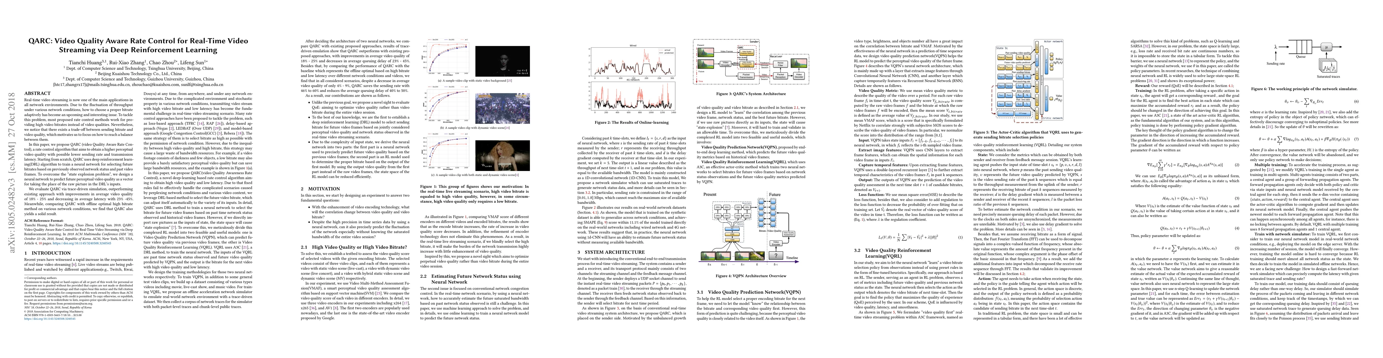 This paper proposes QARC, a deep reinforcement learning-based rate control algorithm for real-time video streaming, aiming to balance bitrate and perceptual video quality. QARC uses a neural network to predict future video quality and optimizes bitrate selection based on network conditions and past video frames.