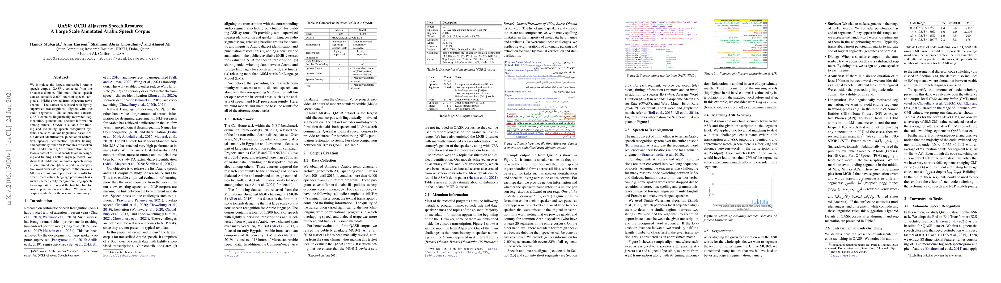 The QASR corpus, the largest transcribed Arabic speech dataset collected from Aljazeera news, provides 2,000 hours of multi-dialect audio with detailed annotations for various NLP tasks, including automatic speech recognition and named entity recognition. The dataset also includes a 130M-word text resource to enhance language models.