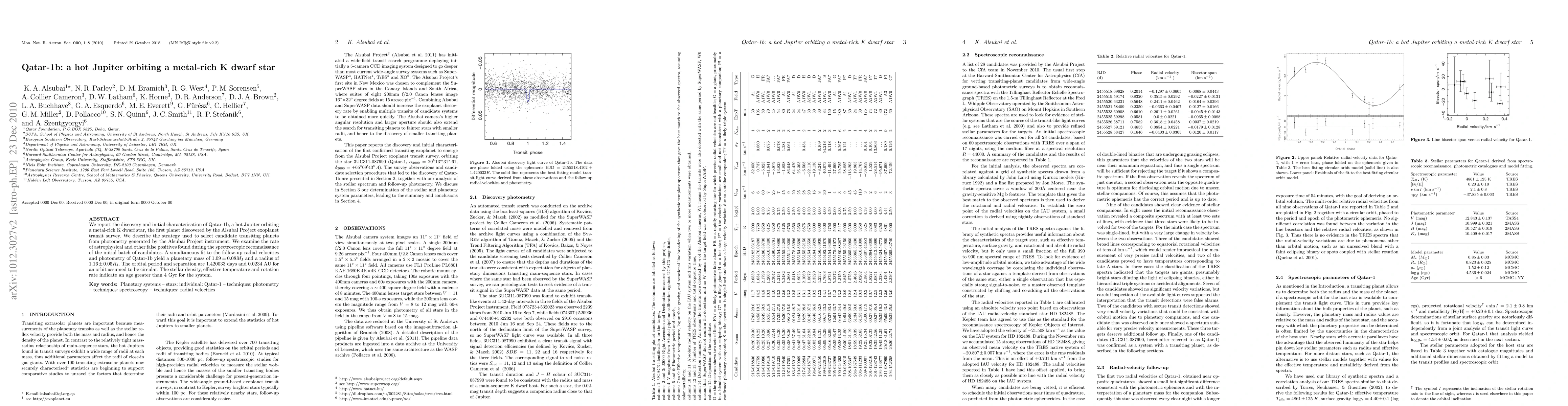 Qatar-1b is a hot Jupiter discovered by the Alsubai Project, orbiting a metal-rich K dwarf star. Its mass and radius are 1.09 Mjup and 1.16 Rjup, respectively, with an orbital period of 1.42 days.