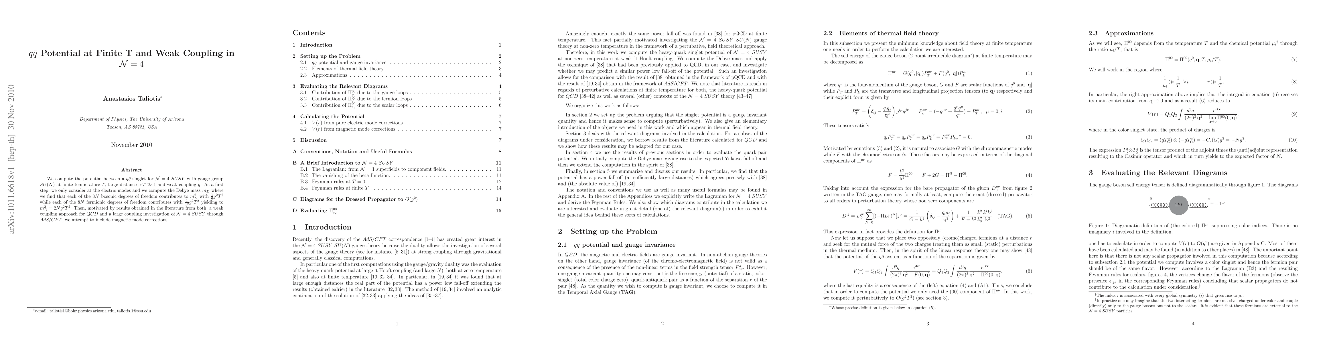 This paper computes the potential between a $q{\bar q}$ singlet in ${\cal N}=4$ SUSY with $SU(N)$ gauge group at finite temperature $T$ and weak coupling $g$, focusing on electric modes. It finds that the Debye mass $m_D^2$ is proportional to $Ng^2T^2$, with contributions from bosonic and fermionic degrees of freedom. The study also aims to incorporate magnetic mode corrections based on prior results from QCD and AdS/CFT.