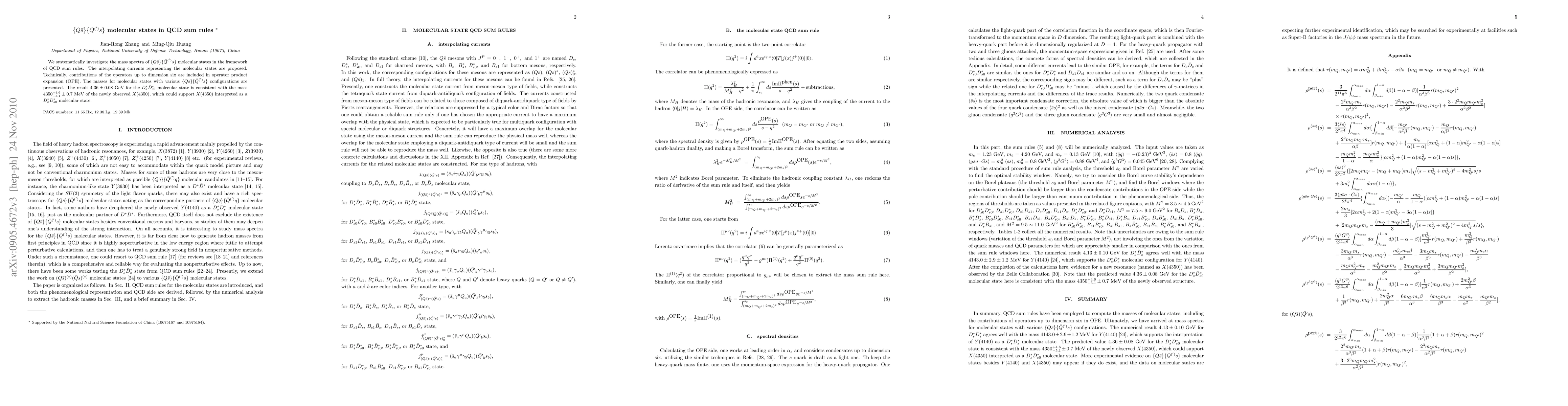 We systematically investigate the mass spectra of $\{Q\bar{s}\}\{\bar{Q}^{(')}s\}$ molecular states in the framework of QCD sum rules. The interpolating currents representing the molecular states are proposed. Technically, contributions of the operators up to dimension six are included in operator product expansion (OPE). The masses for molecular states with various $\{Q\bar{s}\}\{\bar{Q}^{(')}s\}$ configurations are presented. The result $4.36\pm0.08 GeV$ for the $D_{s}^{*}\bar{D}_{s0}^{*}$ molecular state is consistent with the mass $4350^{+4.6}_{-5.1}\pm0.7 MeV$ of the newly observed $X(4350)$, which could support $X(4350)$ interpreted as a $D_{s}^{*}\bar{D}_{s0}^{*}$ molecular state.