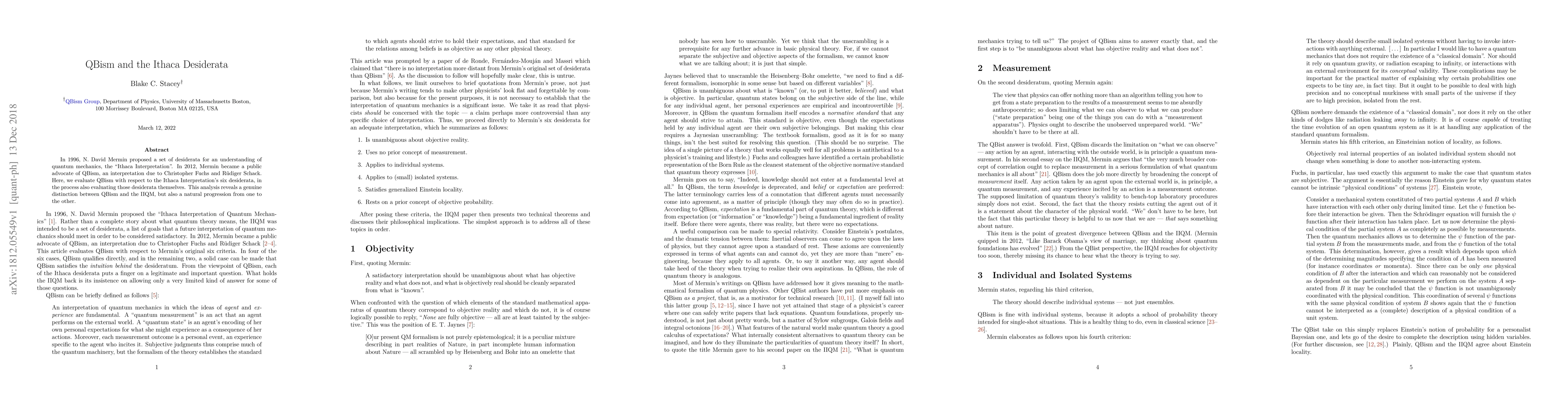 In 1996, N. David Mermin proposed a set of desiderata for an understanding of quantum mechanics, the "Ithaca Interpretation". In 2012, Mermin became a public advocate of QBism, an interpretation due to Christopher Fuchs and Ruediger Schack. Here, we evaluate QBism with respect to the Ithaca Interpretation's six desiderata, in the process also evaluating those desiderata themselves. This analysis reveals a genuine distinction between QBism and the IIQM, but also a natural progression from one to the other.