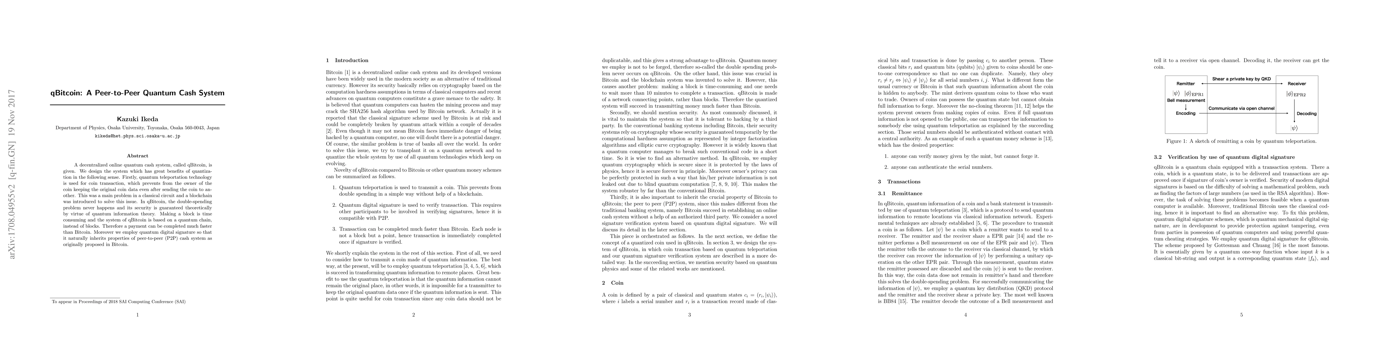 A decentralized online quantum cash system, called qBitcoin, is given. We design the system which has great benefits of quantization in the following sense. Firstly, quantum teleportation technology is used for coin transaction, which prevents from the owner of the coin keeping the original coin data even after sending the coin to another. This was a main problem in a classical circuit and a blockchain was introduced to solve this issue. In qBitcoin, the double-spending problem never happens and its security is guaranteed theoretically by virtue of quantum information theory. Making a block is time consuming and the system of qBitcoin is based on a quantum chain, instead of blocks. Therefore a payment can be completed much faster than Bitcoin. Moreover we employ quantum digital signature so that it naturally inherits properties of peer-to-peer (P2P) cash system as originally proposed in Bitcoin.