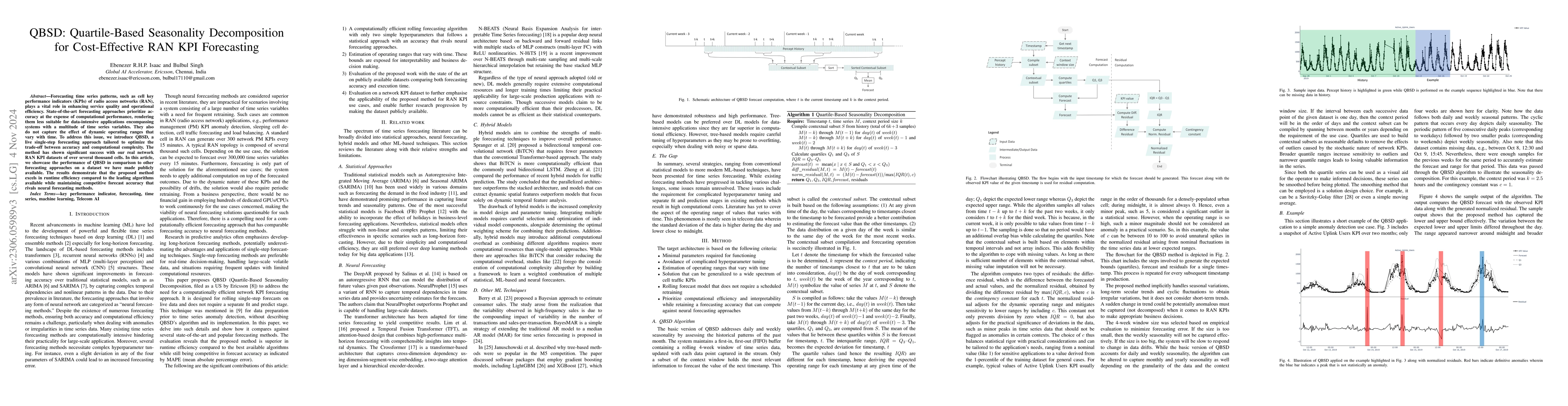 The QBSD method optimizes the trade-off between forecasting accuracy and computational efficiency for time series patterns in telecom KPIs. It outperforms state-of-the-art approaches in runtime efficiency while maintaining competitive accuracy, validated on both public and proprietary datasets.