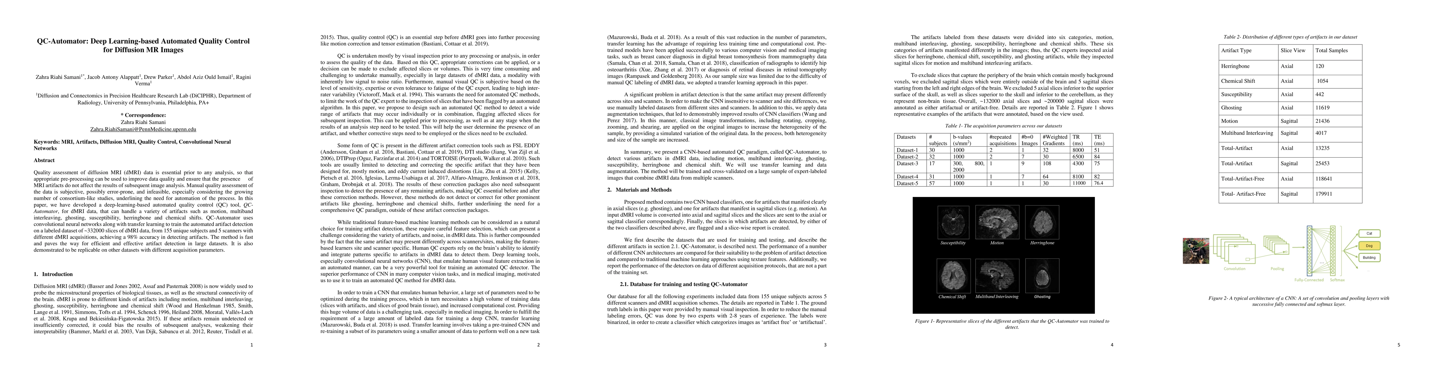 Quality assessment of diffusion MRI (dMRI) data is essential prior to any analysis, so that appropriate pre-processing can be used to improve data quality and ensure that the presence of MRI artifacts do not affect the results of subsequent image analysis. Manual quality assessment of the data is subjective, possibly error-prone, and infeasible, especially considering the growing number of consortium-like studies, underlining the need for automation of the process. In this paper, we have developed a deep-learning-based automated quality control (QC) tool, QC-Automator, for dMRI data, that can handle a variety of artifacts such as motion, multiband interleaving, ghosting, susceptibility, herringbone and chemical shifts. QC-Automator uses convolutional neural networks along with transfer learning to train the automated artifact detection on a labeled dataset of ~332000 slices of dMRI data, from 155 unique subjects and 5 scanners with different dMRI acquisitions, achieving a 98% accuracy in detecting artifacts. The method is fast and paves the way for efficient and effective artifact detection in large datasets. It is also demonstrated to be replicable on other datasets with different acquisition parameters.