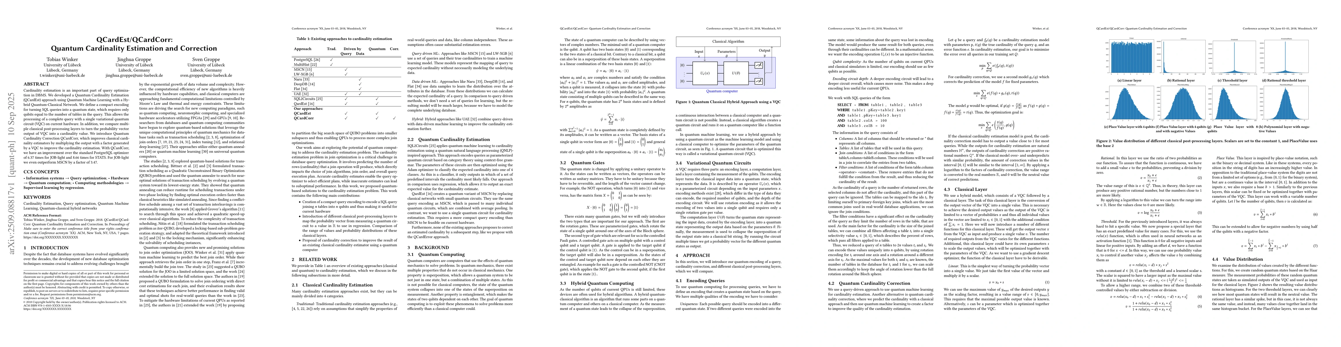 Cardinality estimation is an important part of query optimization in DBMS. We develop a Quantum Cardinality Estimation (QCardEst) approach using Quantum Machine Learning with a Hybrid Quantum-Classical Network. We define a compact encoding for turning SQL queries into a quantum state, which requires only qubits equal to the number of tables in the query. This allows the processing of a complete query with a single variational quantum circuit (VQC) on current hardware. In addition, we compare multiple classical post-processing layers to turn the probability vector output of VQC into a cardinality value. We introduce Quantum Cardinality Correction QCardCorr, which improves classical cardinality estimators by multiplying the output with a factor generated by a VQC to improve the cardinality estimation. With QCardCorr, we have an improvement over the standard PostgreSQL optimizer of 6.37 times for JOB-light and 8.66 times for STATS. For JOB-light we even outperform MSCN by a factor of 3.47.