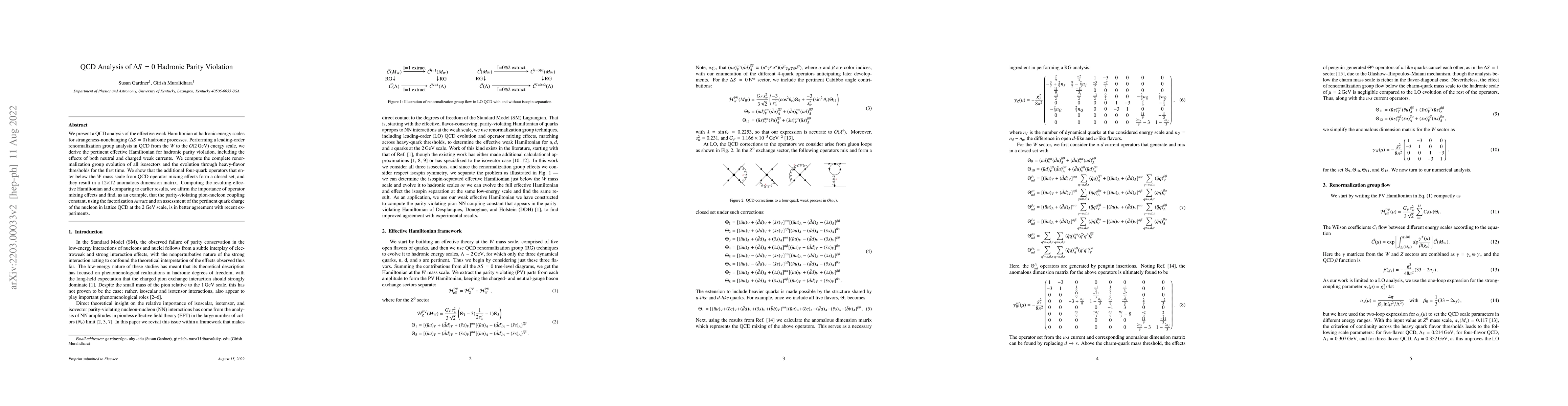 This paper conducts a QCD analysis of $\Delta S=0$ hadronic parity violation, deriving the effective weak Hamiltonian through a leading-order renormalization group analysis. It highlights the importance of operator mixing effects and shows improved agreement with recent experimental results for the pion-nucleon coupling constant.