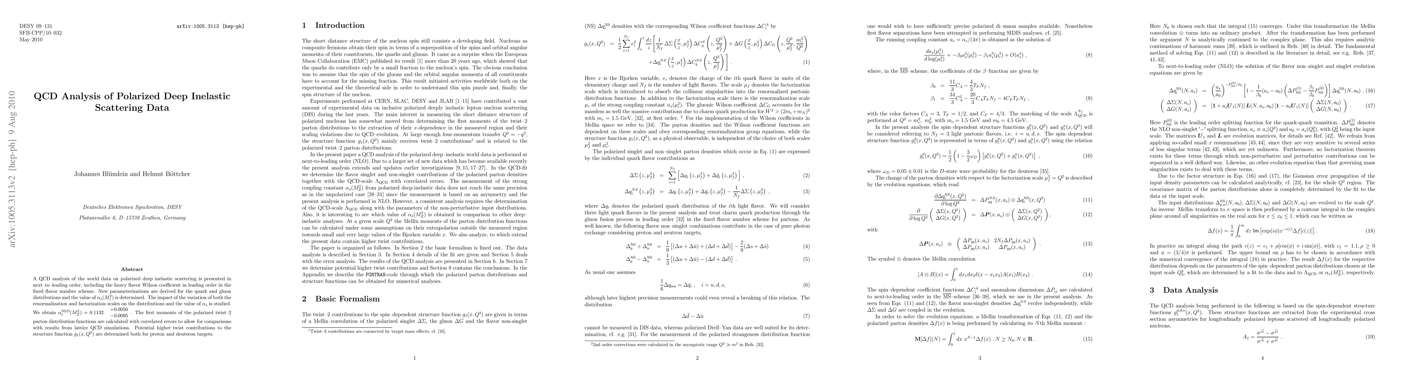 A QCD analysis of the world data on polarized deep inelastic scattering is presented in next--to--leading order, including the heavy flavor Wilson coefficient in leading order in the fixed flavor number scheme. New parameterizations are derived for the quark and gluon distributions and the value of $\alpha_s(M_z^2)$ is determined. The impact of the variation of both the renormalization and factorization scales on the distributions and the value of $\alpha_s$ is studied. We obtain $\alpha_s^{\rm NLO}(M_Z^2) = 0.1132~~\begin{array}{l} + 0.0056 \\ -0.0095 \end{array}$. The first moments of the polarized twist--2 parton distribution functions are calculated with correlated errors to allow for comparisons with results from lattice QCD simulations. Potential higher twist contributions to the structure function $g_1(x,Q^2)$ are determined and found to be compatible with zero both for proton and deuteron targets.