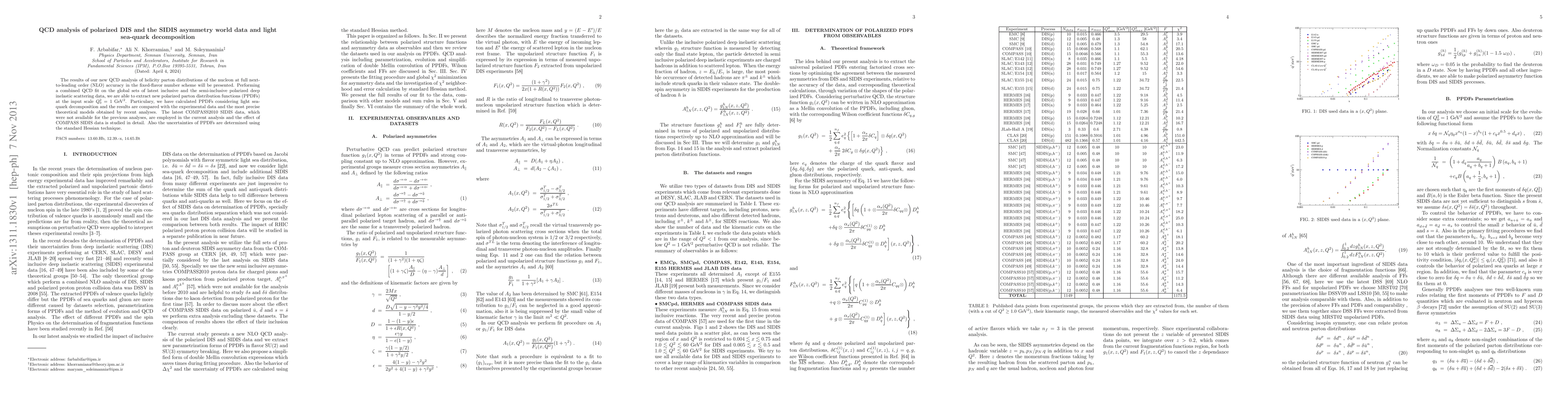 The results of our new QCD analysis of helicity parton distributions of the nucleon at full next-to-leading order (NLO) accuracy in the fixed-flavor number scheme will be presented. Performing a combined QCD fit on the global sets of latest inclusive and the semi-inclusive polarized deep inelastic scattering data, we are able to extract new polarized parton distribution functions (PPDFs) at the input scale $Q_{0}^2=1$ GeV$^2$. Particulary, we have calculated PPDFs considering light sea-quark decomposition and the results are compared with the experimental data and the most precise theoretical models obtained by recent analyses. The latest COMPASS2010 SIDIS data, which were not available for the previous analyses, are employed in the current analysis and the effect of COMPASS SIDIS data is studied in detail. Also the uncertainties of PPDFs are determined using the standard Hessian technique.