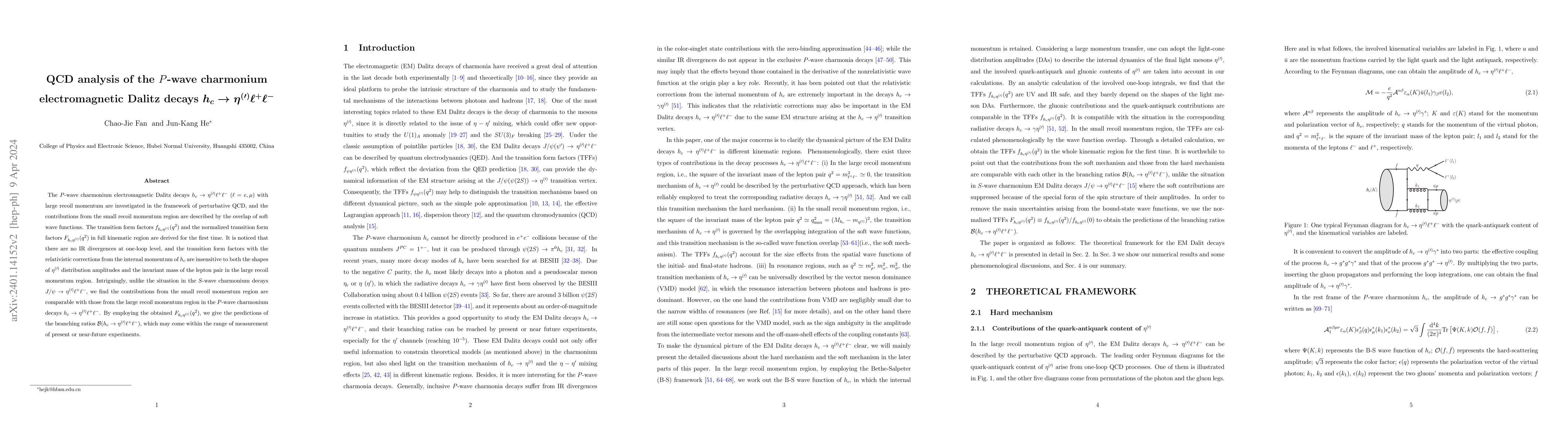 The $P$-wave charmonium electromagnetic Dalitz decays $h_{c}\rightarrow\eta^{(\prime)}\ell^{+}\ell^{-}$ $(\ell=e, \mu)$ with large recoil momentum are investigated in the framework of perturbative QCD, and the contributions from the small recoil momentum region are described by the overlap of soft wave functions. The transition form factors $f_{h_{c}\eta^{(\prime)}}(q^{2})$ and the normalized transition form factors $F_{h_{c} \eta^{(\prime)}}(q^{2})$ in full kinematic region are derived for the first time. It is noticed that there are no IR divergences at one-loop level, and the transition form factors with the relativistic corrections from the internal momentum of $h_{c}$ are insensitive to both the shapes of $\eta^{(\prime)}$ distribution amplitudes and the invariant mass of the lepton pair in the large recoil momentum region. Intriguingly, unlike the situation in the $S$-wave charmonium decays $J/\psi\rightarrow\eta^{(\prime)}\ell^{+}\ell^{-}$, we find the contributions from the small recoil momentum region are comparable with those from the large recoil momentum region in the $P$-wave charmonium decays $h_{c}\rightarrow\eta^{(\prime)}\ell^{+}\ell^{-}$. By employing the obtained $F_{h_{c} \eta^{(\prime)}}(q^{2})$, we give the predictions of the branching ratios $\mathcal{B}(h_{c}\rightarrow\eta^{(\prime)}\ell^{+}\ell^{-})$, which may come within the range of measurement of present or near-future experiments.