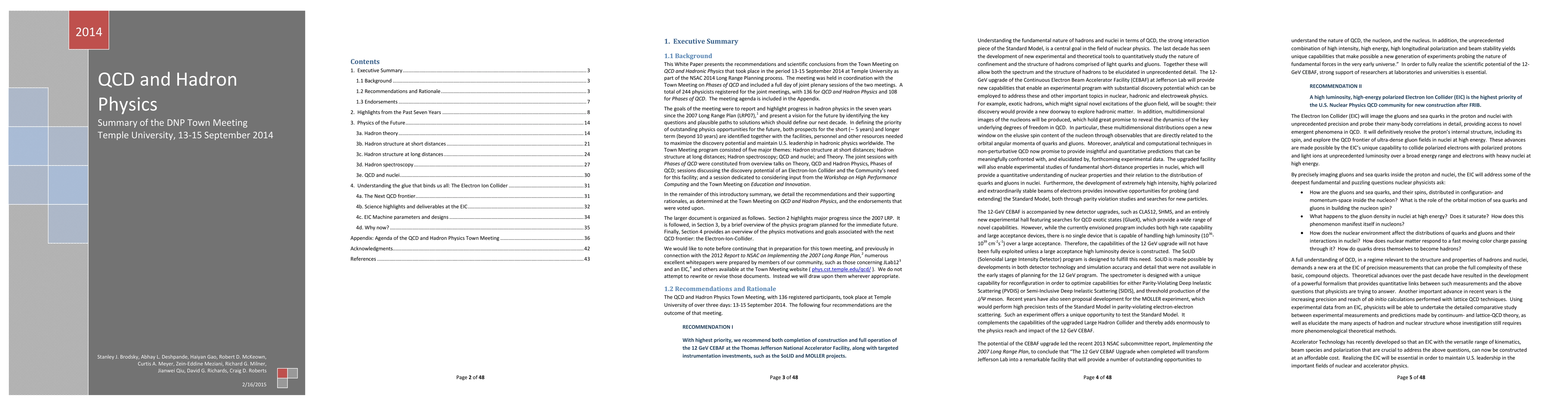 This document presents the recommendations and scientific conclusions from the Town Meeting on QCD and Hadronic Physics that took place in the period 13-15 September 2014 at Temple University as part of the NSAC 2014 Long Range Planning process. It highlights progress in hadron physics in the seven years since the 2007 Long Range Plan (LRP07), and presents a vision for the future by identifying key questions and plausible paths to solutions which should define our next decade. In defining the priority of outstanding physics opportunities for the future, both prospects for the short (roughly 5 years) and longer term (beyond 10 years) are identified together with the facilities, personnel and other resources needed to maximize the discovery potential in hadronic physics worldwide. In this connection, the potential of an electron ion collider is highlighted.