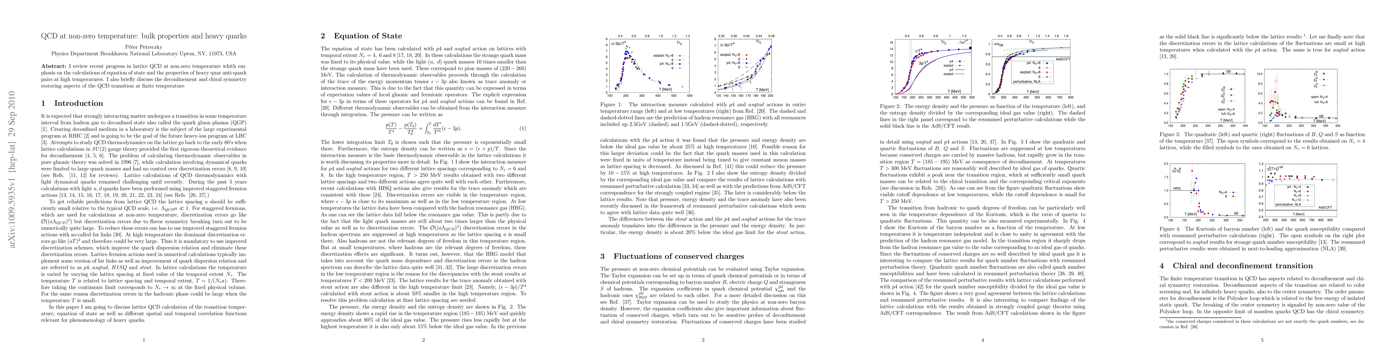 Summary: This review outlines recent advancements in lattice QCD studies at non-zero temperatures, focusing on the equation of state and properties of heavy quark-antiquark pairs. It also touches on deconfinement and chiral symmetry restoration during the QCD transition at finite temperatures.